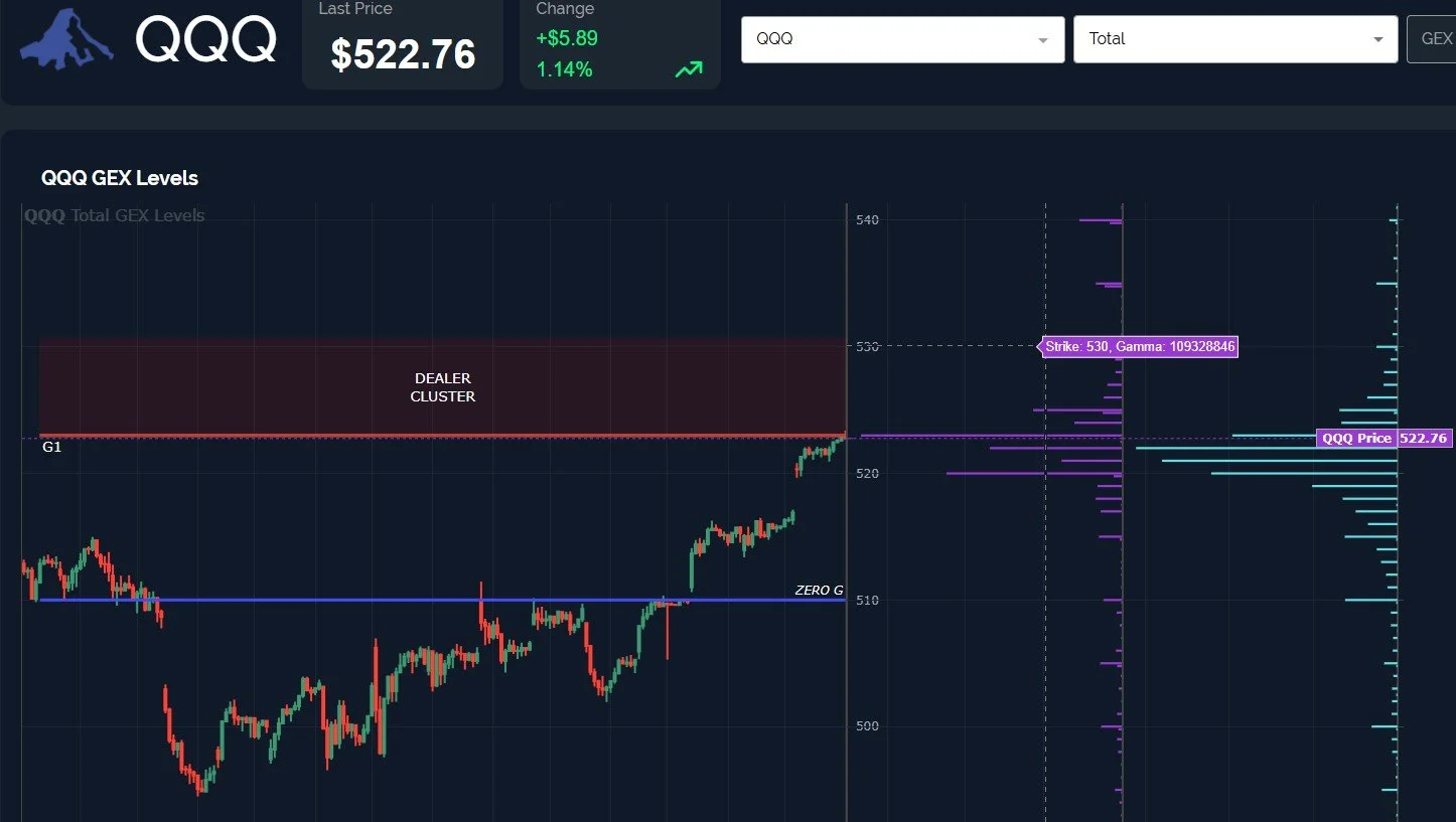 Lastly, the light blue bars to the right of the purple net GEX bars indicate daily option volume. While very speculative as to what it means, I see very little option volume at higher prices and a lot of option volume from 510 (the zero GEX line) up to 520.