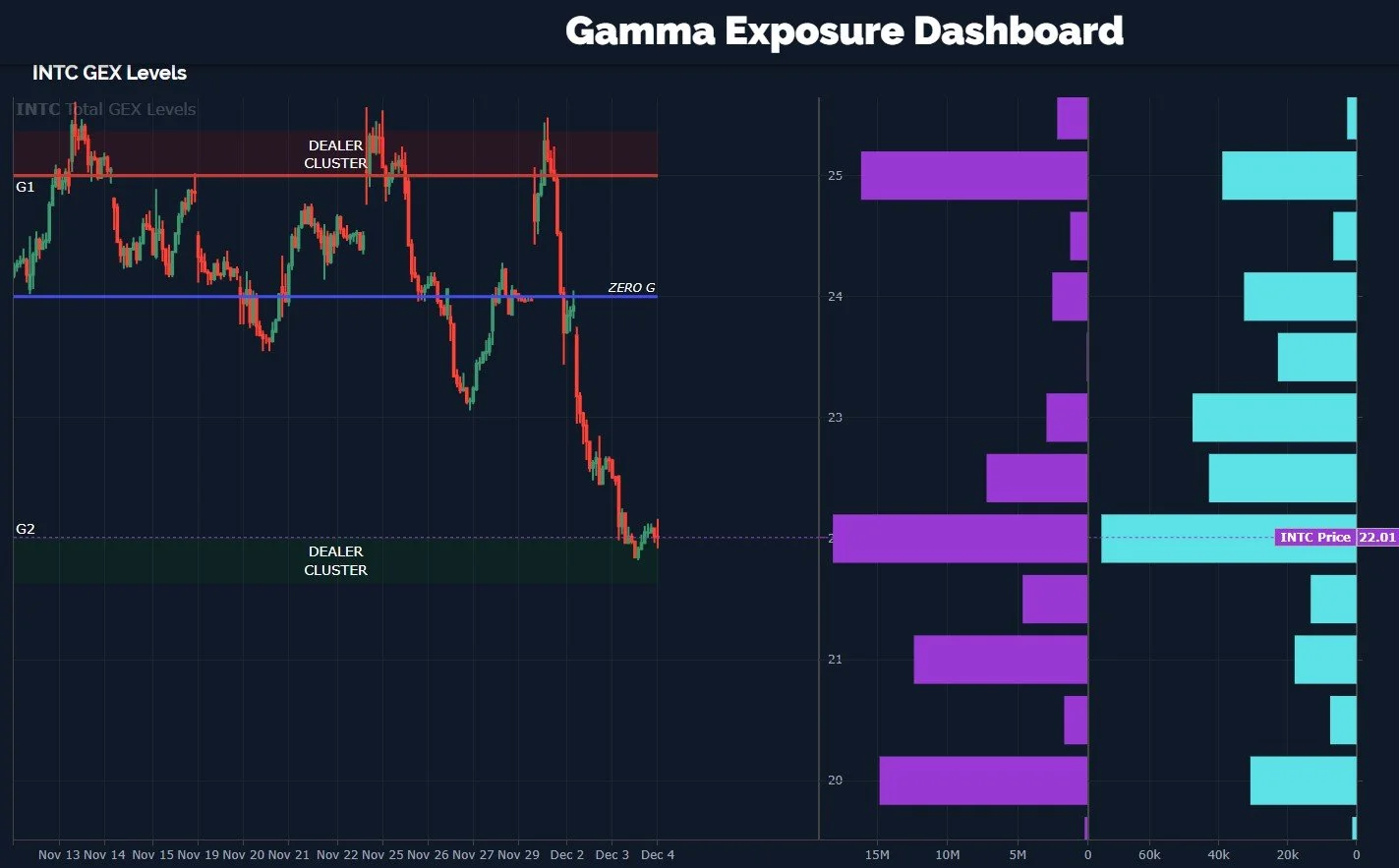 This particular 22 area matches a G2 Dealer Cluster zone where we might see INTC reverse back up. GEX at 21 also looks meaningful, so any further incursion to the downside may also represent a buy-the-dip opportunity. We see volume today at 22, and we have a big GEX cluster at 25, which represents the G1 Dealer Cluster, so maybe INTC can give us a year-end whipsaw just to shake things up. GEX is barely positive, but it’s still positive, so we don’t see participants reflecting as bearish of a stance with GEX positioning as we see with the price itself lately.