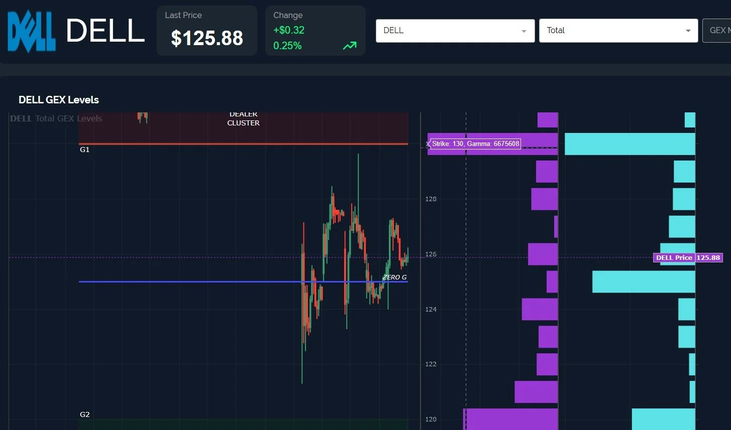 What I like about DELL (other than the pullback for possible entry) is that we have positive overall GEX and we see a large cluster at 130, as well as accompanying volume at that strike. With the middle Keltner at 133.50, perhaps an upside target of 130-133 isn’t an unreasonable potential trade. We’ll also want to see what happens to GEX as we move higher.