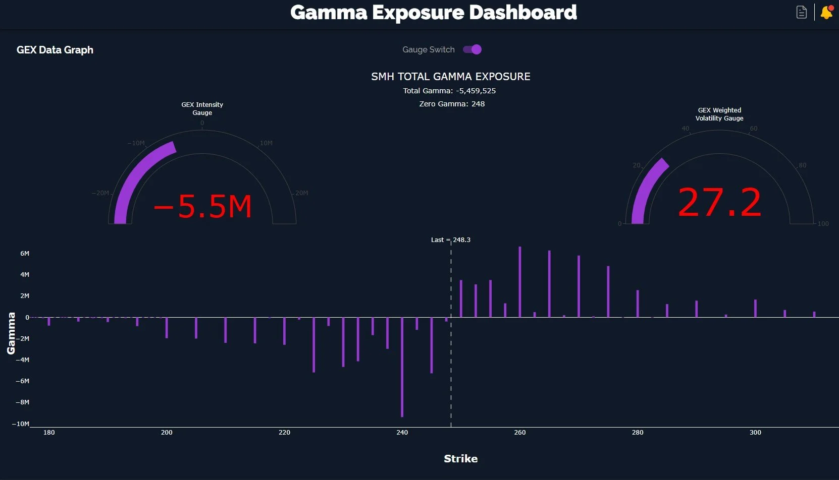 Unlike QQQ (which is strange, given that SMH has largely driven QQQ higher over time), SMH currently shows negative GEX and a GEX weighted volatility gauge that is somewhat higher than QQQ. Despite the individual strikes at higher prices showing at least some interest from 260-280, the negative total net GEX is concerning because of SMH’s role in leading the way for QQQ for much of this bull market.