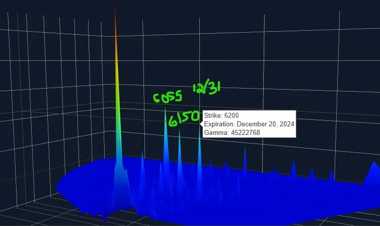 Friday morning, in our Discord server, I posted the 3D graph you see below, highlighting where we see the next largest GEX clusters concentrated, with 6150 and 6200 both representing the largest focal points on December 20.