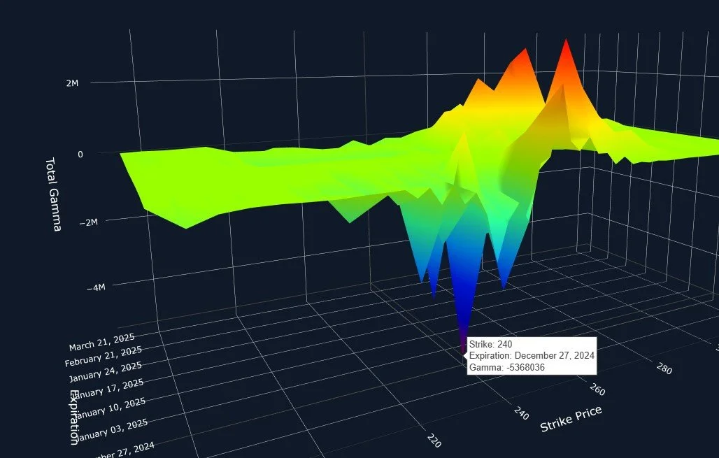The 3D graph also shows SMH’s largest single GEX cluster to be the negative GEX at the 240 strike for the December 27 expiration. As mentioned, this doesn’t mean NVDA won’t hit 150, that could easily happen while SMH flounders or possibly participates in a very late-stage move to match QQQ’s advance, but each ticker deserves attention to their specific setup, in our view.