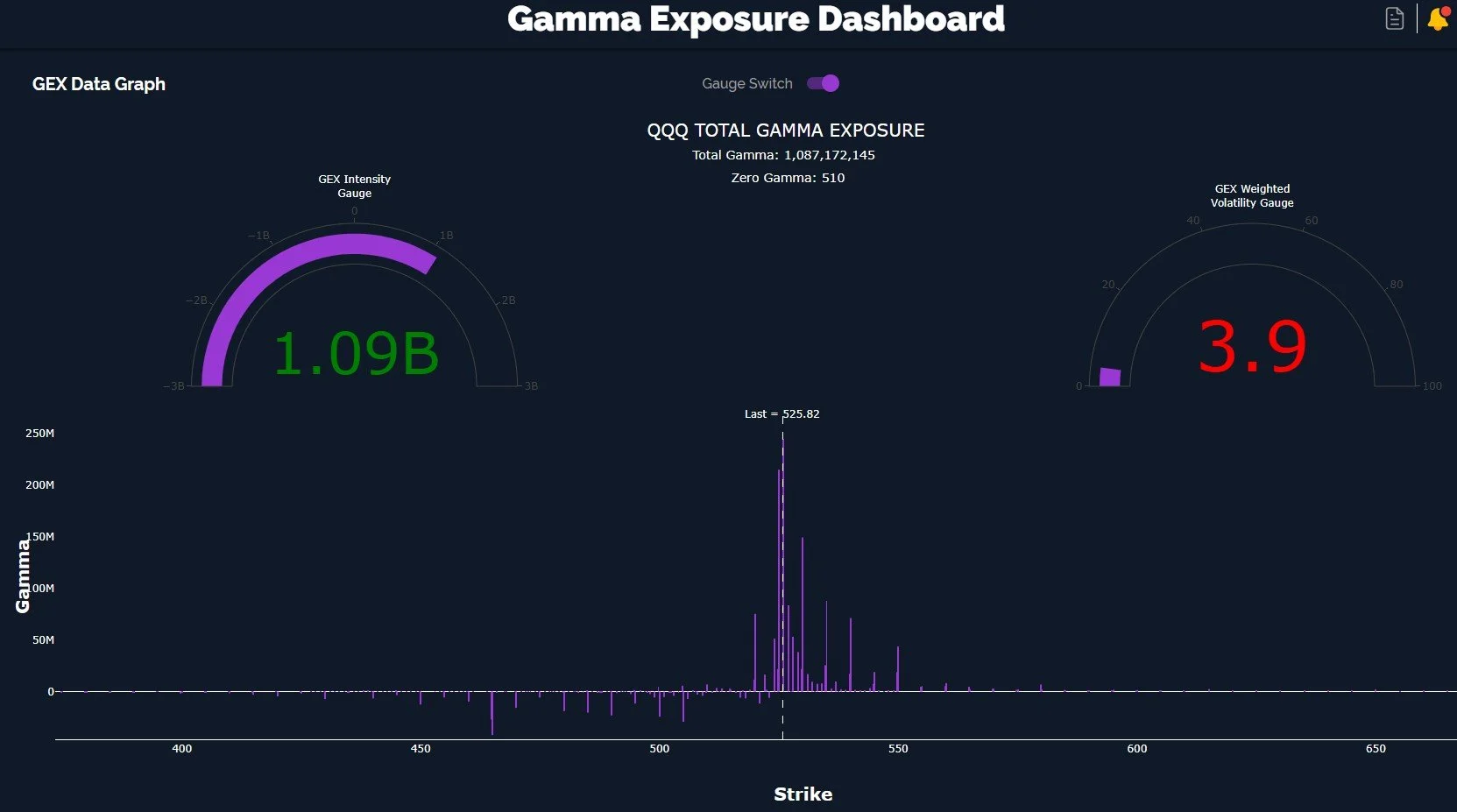 QQQ shows over 1B in positive GEX, but a very low GEX-weighted Volatility Gauge, implying that QQQ is far less volatile than at other times over the last year. But is the lack of volatility sustainable?