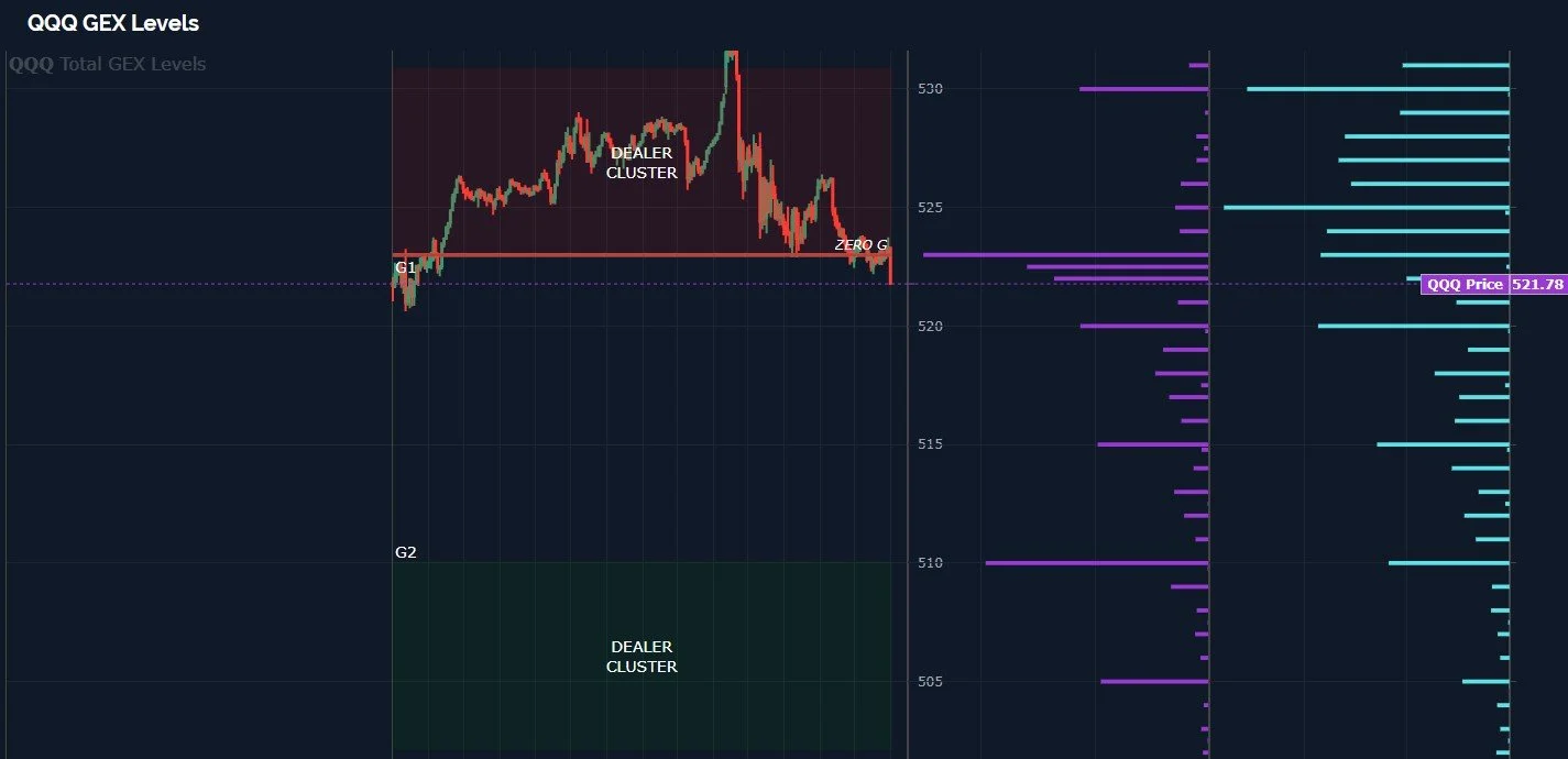 Despite SPX closing below the Hull, Friday’s dip took us into a Dealer Cluster zone, though just barely. It’s hard to get excited about shorting when we’re sitting in a zone where we expect dealers to potentially become buyers, even if the box stretches downward toward 5900. Volume Friday was fairly dispersed across positive and negative strikes as well. All-in-all, SPX’s chart looks like bears are in short-term control, while GEX suggests buyers have an edge on account of showing neutral total GEX and sitting atop the G2 Dealer Cluster. Let’s see if QQQ agrees.