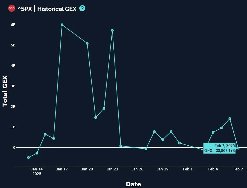 The Historical GEX graph below shows SPX barely tapping into negative GEX territory as of Friday’s close, though I looked at the 3D graph and adding back the GEX rolling off by tomorrow morning will put us back in slightly positive territory. New positioning Monday can and will alter the reading as well, so the bottom line is that GEX is currently firmly in neutral territory, not an actionable reading in and of itself.