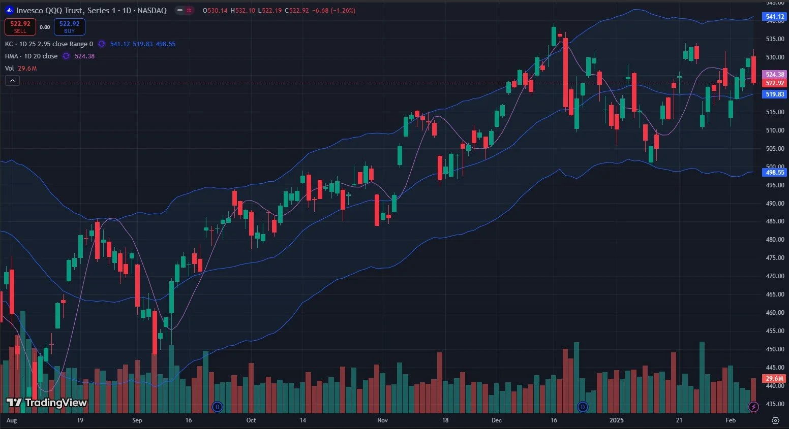 QQQ’s chart looks fairly similar to SPX: Almost 2 days of gains wiped out with a big red candle that took price back below the Hull. The middle Keltner channel is close at 519.83, perhaps the next spot to watch if things turn south tomorrow.