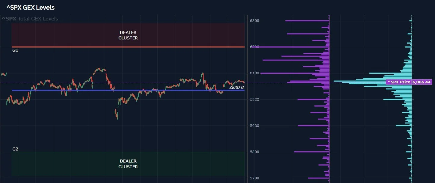 Our GEX Levels chart reflects total net GEX at all strikes (purple, with GEX below the zero line being negative) and today’s volume in light blue to the right. While toying with this zero gamma line for days on end, the GEX at higher strikes has grown, with 6200-6300 showing formidable concentrations. The positive GEX clusters are significant relative to the negative clusters below. It is interesting (to me) that the highest volume that was also farthest away from the spot price was at the 5900 strike, a negative, but the volume at 6100 also stands out.