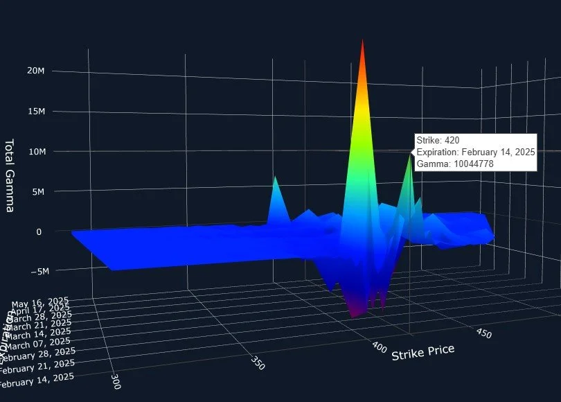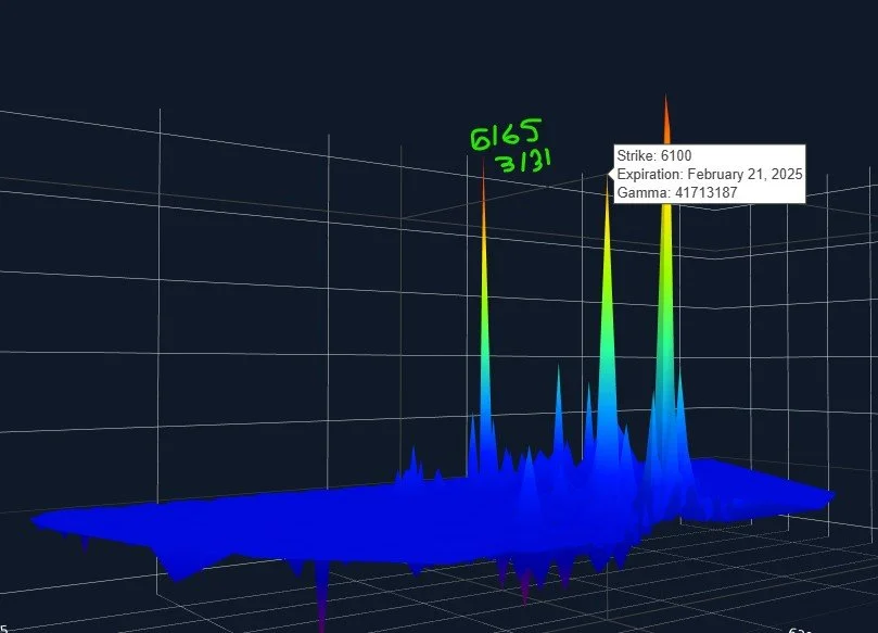 Can we ascertain any other clues from the 3D graph, which show all GEX clusters at every strike and date? Good question, thank you for asking. Other than the largest cluster attributed to today’s close, 6100 stands out as a major cluster for Friday, 2/21, and 6165 on 3/31. While we see 6200 as a large overall net GEX cluster, the expirations are a bit more spread out, hence the lack of one singular large expiration.