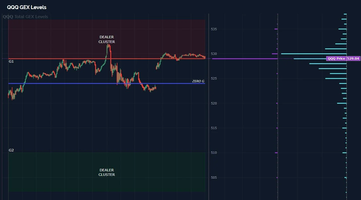 QQQ GEX Levels haven’t changed much, we still see QQQ at the lower edge of the upper G1 Dealer Cluster zone, which stretches just beyond the 535 strike. Certainly a less bullish picture than SPX, with potentially 1% or so upside, but we did see QQQ total net GEX go from fairly negative to positive 389M, a wide swing. If QQQ continues toward the higher edges of the zone, where does it find the fuel?