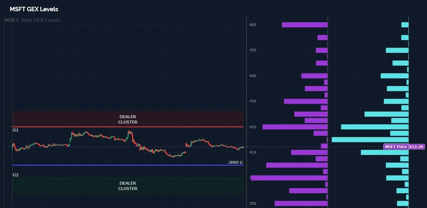 This Friday’s largest GEX cluster is at 420, within 1% of the middle Keltner, also potentially signaling near-term potential for higher prices before we need to re-evaluate MSFT’s prospects.