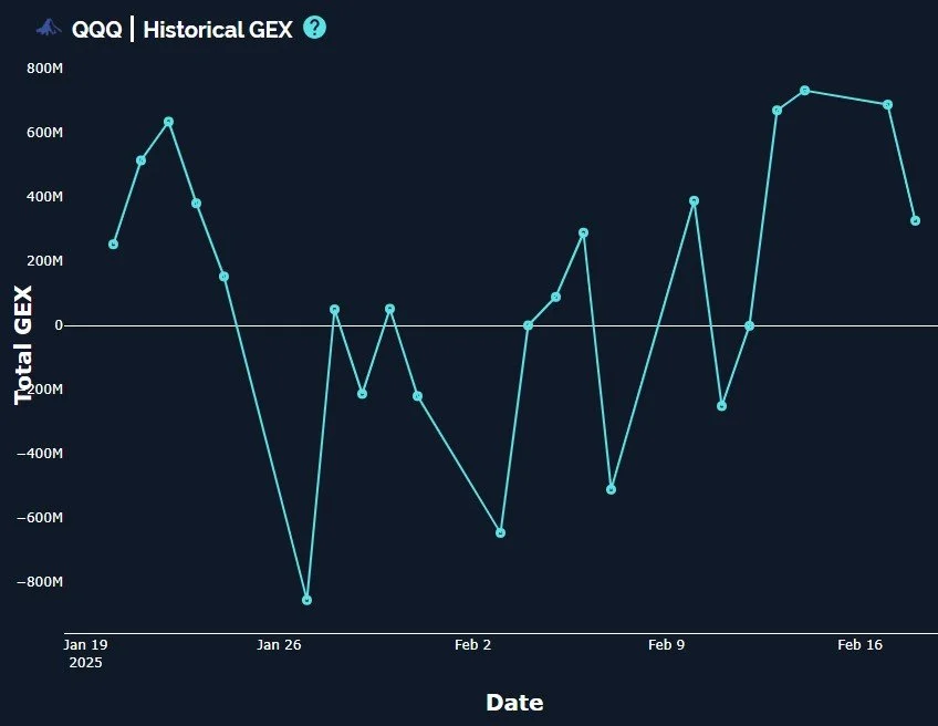 We discussed the contrast with SPX yesterday but we didn’t share any visuals. Here’s SPX’s historical GEX over the last month. Notice the extreme top in January, yet SPX has changed much more modestly than SPY recently, seemingly unexcited to the upside or downside. Today’s decline from just under 2B to 1.45B is far less dramatic than SPY and maintains a somewhat more positive view looking ahead, given the maintenance of net total GEX over 1B.