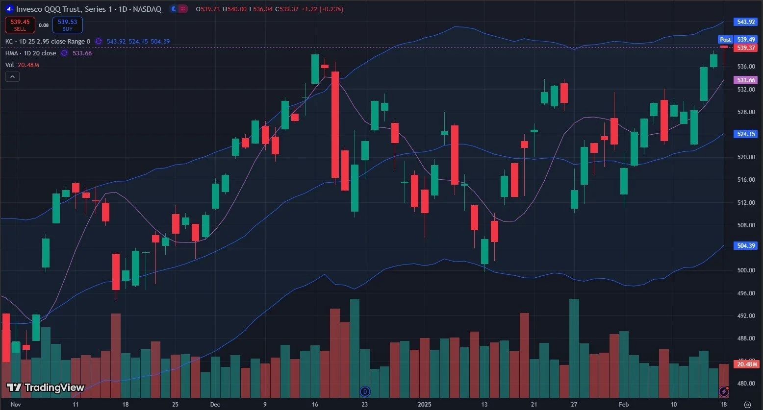 QQQ gapped up today, getting a bit ahead of itself and experiencing some liquidation intraday. Buyers decided it was the bargain of a lifetime (at all-time highs?) and bought the micro-dip, though they were unable to turn today’s candle green. That’s alright, after 5 green candles in a row, it’s time for a little color change. QQQ’s upper Keltner channel increased slightly to 543.92 (one point), and the middle and lower channel are also pointing higher, a bullish observation.