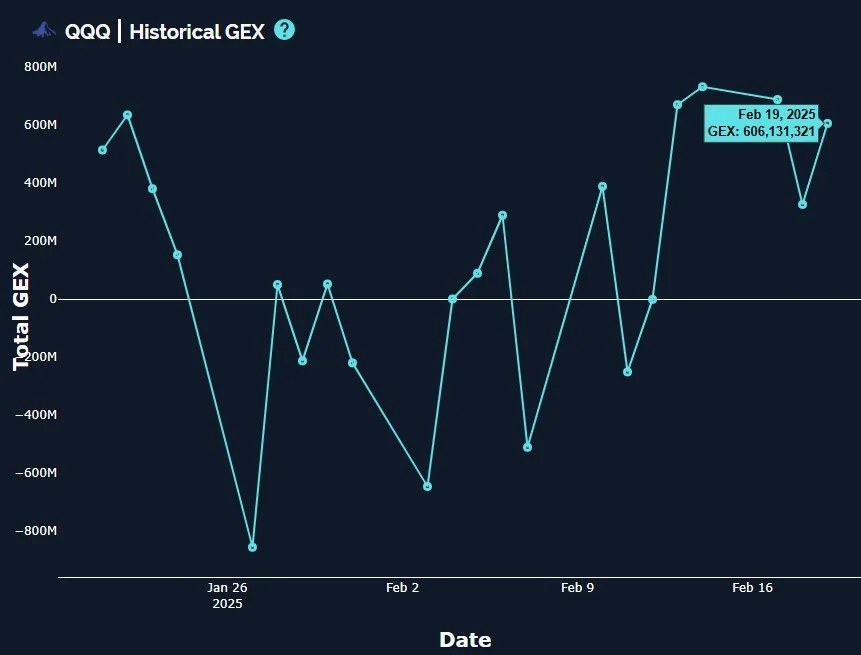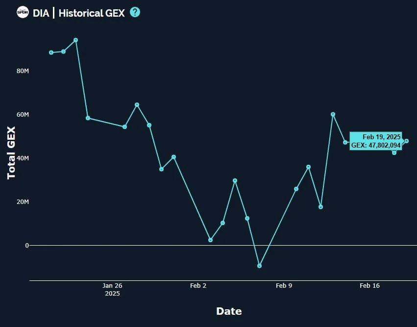 Let’s revisit DIA, which we haven’t spent much time on lately. DIA has been a good leading indicator at times, as strange as that may seem. We highlighted the late January timeframe when DIA seemed to be topping, and sure enough, it did have a small pullback. However, this pullback morphed into sideways consolidation, building out the pattern of a flag instead of a downward slope on the rollercoaster. As you can see on the chart above, this sideways consolidation, combined with a steeply rising Keltner channel and price holding above the Hull moving average, creates a picture of an index that appears to be ready for another leg higher, potentially to 455-460. Let’s see if gamma exposure (GEX) agrees.