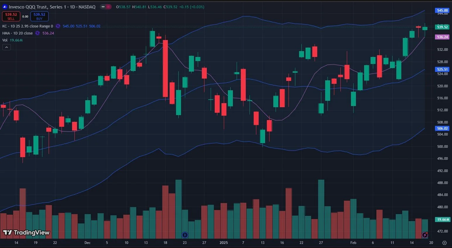 In contrast to the very bullish DIA chart, QQQ looks more modestly positive, though we can admit the Keltners are still pointing somewhat higher and price is holding above the Hull. We don’t see as much overhead room before QQQ exceeds that upper Keltner channel, and GEX hasn’t been growing at higher prices, either (though SPX has seen an increase in GEX at higher strikes). If the Keltners are accurate, the odds of breaching and holding above 545 are not great at the current moment, leaving a little over 1% upside from these levels.