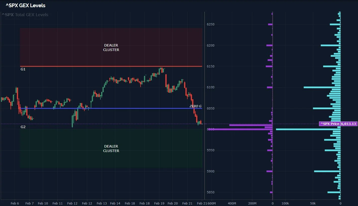 Another observation is that we are almost in the lower Dealer Cluster zone, with 5970 fitting well within that box, and most volume Friday (the light blue horizontal bars) was at higher strikes, which seems bullish. The upper Dealer Cluster zone still holds hope for 6200 into March.