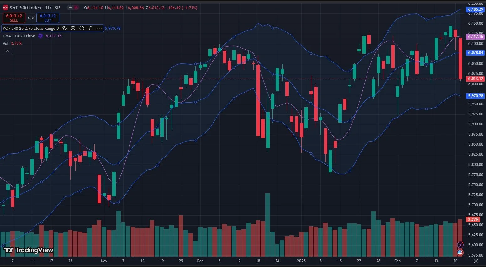 Let’s start off by glancing at SPX’s chart above. The top Keltner is pointing way up despite the huge red candle from Friday. Any big move happening on OpEx is suspect in my view, because the expiring options have an outsized impact on trading for the day. If downside continues, SPX may drop all the way to 5897 or lower, based on the lower Keltner channel, though the 4-hour chart below shows that we may find support earlier at 5970. The 4-hour Keltners have captured SPX’s moves fairly well, though you can see the occasional overshoot or undershoot does happen, at least briefly. So even if the 4-hour Keltners end up being very relevant, we may overshoot to the downside.