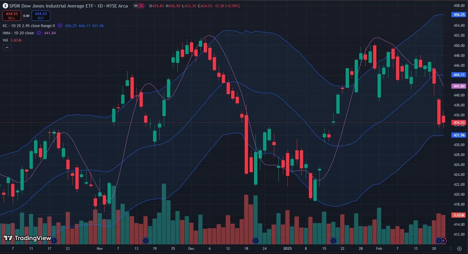 DIA looks more constructive than QQQ in several ways, and DIA is already closer to its lower Keltner channel, currently just below 432. The upper Keltner channel is still pointing higher as well. Some interesting DIA tidbits from today: DIA made the exact same intraday low as it made yesterday, 433.35. DIA closed higher today, unlike SPX or QQQ (the candle coloration is determined by the change after the open, not the prior day’s close). I consider this a mark in favor of a potential rebound just around the corner.