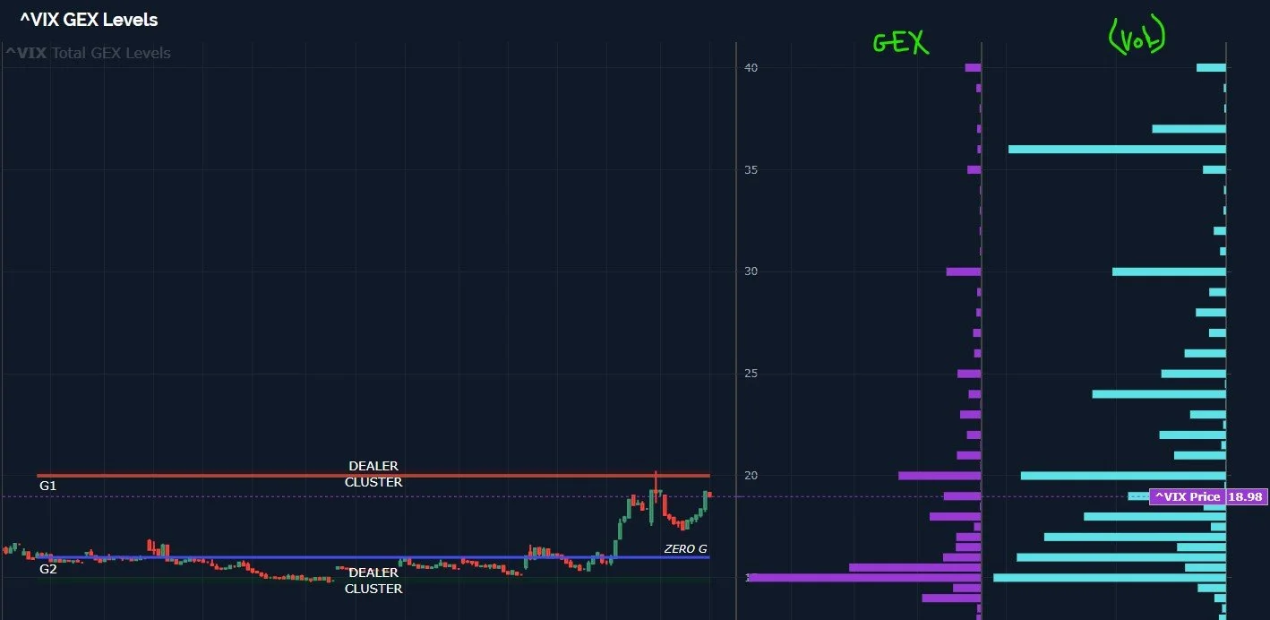 Another question mark arises from the VIX, which did finally tag the upper Dealer Cluster zone at 20, though we continue seeing volume come in at higher strikes, mostly right at 20 (which makes sense) and then at 36.