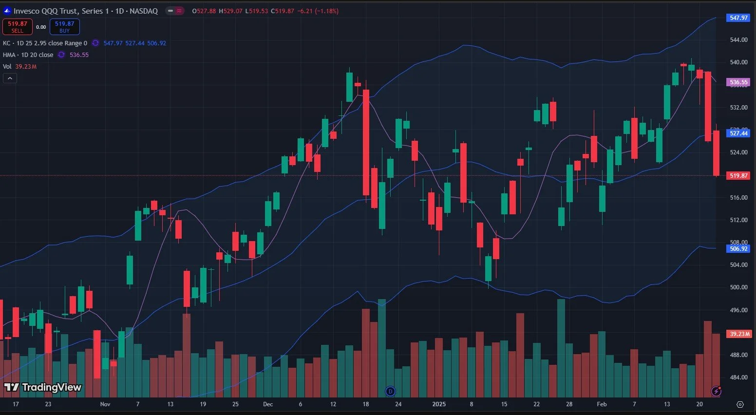 The GEX levels chart below shows QQQ to be at the doorstep to the lower G2 Dealer Cluster zone-an area where we expect dealers may become buyers. This zone does extend down a bit, and an overshoot would place QQQ’s price within range of the lower daily Keltner channel, so we keep the range in mind as we’re looking to make buying decisions in this zone. Note that we had noteworthy volume today (the light blue horizontal bars to the right) at 530 and 540, noticeably more significant than the volume at lower strikes.
