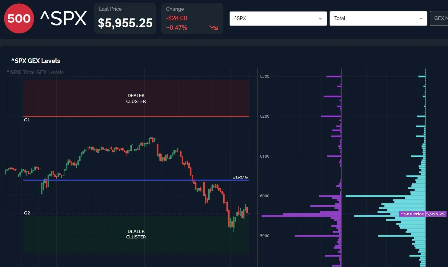 We noted that SPX and QQQ still had room to reach the lower Keltner channels, despite closing near the bottom of the 4-hour Keltner channels yesterday. We mentioned QQQ’s potential to reach 507, though QQQ stopped shy of 507, instead rebounding off of the approximately 510 GEX cluster, also a meaningful and intuitive area for a bounce. SPX saw seemingly eager effort to buy the lows today, despite not closing positive, almost reaching the lower Keltner channel. Declines can be messy, we might overshoot that lower boundary, but the oversold conditions and extreme GEX-weighted volatility coupled with deeply negative GEX can lead to a strong bounce any time. 6061-6075 SPX would be some areas on the chart to watch, but let’s look at the GEX picture for SPX.