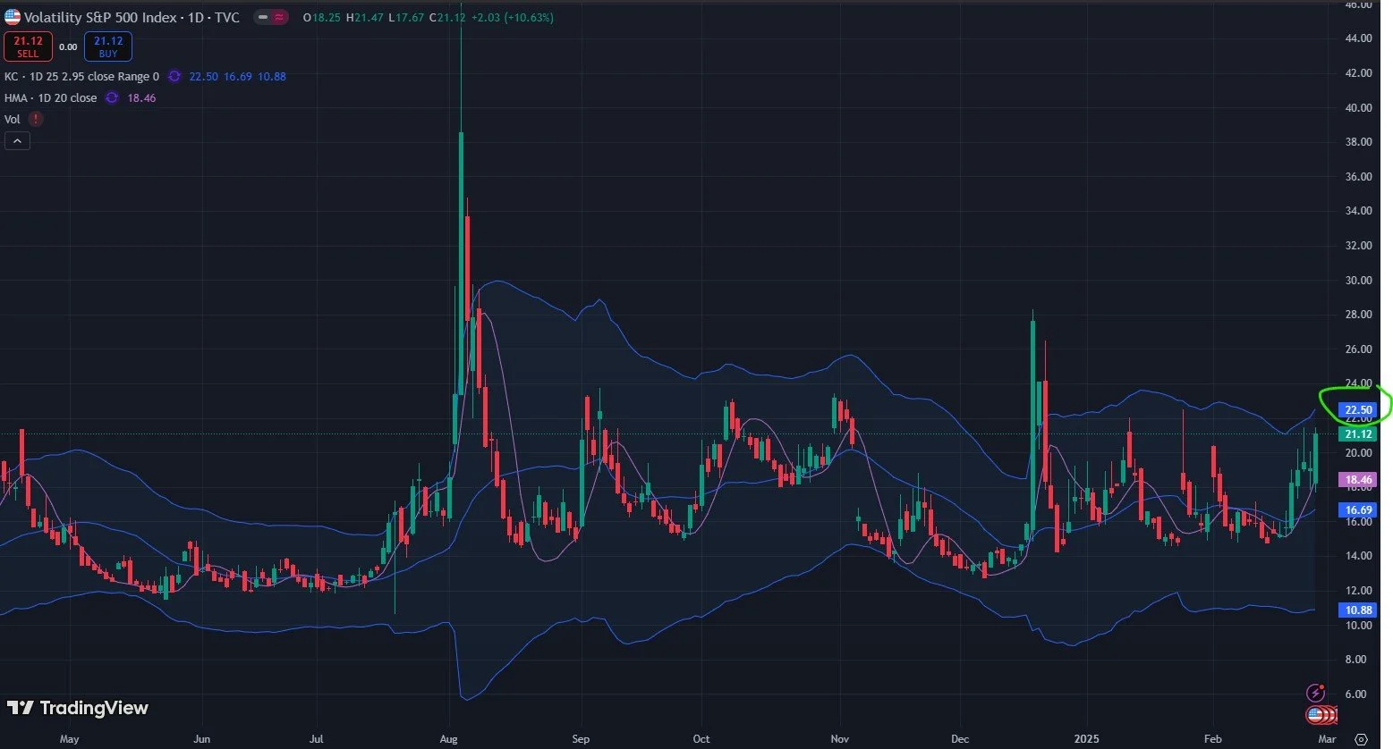 Lastly, the concern we had about the VIX holding above the Hull moving average proved to be valid, with a big green candle that took the VIX over 21 today. We were looking at 22 due to the upper Keltner channel, but the Keltner is moving higher, now pointing to 22.5+. If tomorrow does end up marking a short-term selling culmination, we may see the VIX spike above the upper Keltner. It’s hard to predict where the VIX may go in a disorderly selloff, so the character of any further downside move will have a big impact on whether or not the VIX stays within the Keltner boundaries or if we see more of a rocket ship move like in December or especially last August.