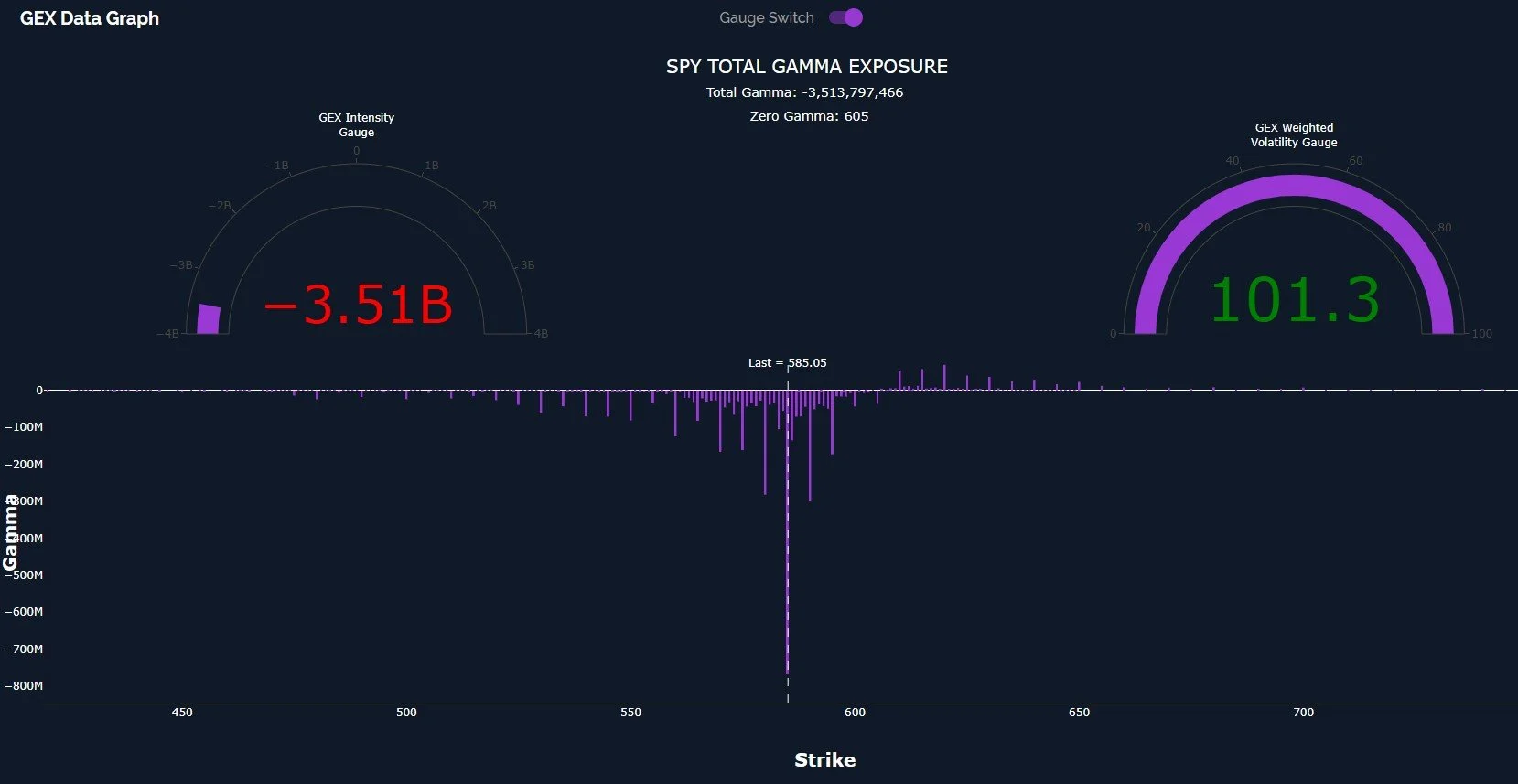 Our GEX Intensity Gauge for SPY shows an extreme -3.5B. Each time we’ve seen a major index get close to -4B over the last year and a half or so, we have seen a powerful bounce, even if only temporarily. The GEX Weighted Volatility Gauge looks at implied volatility, and the current reading shows participants are expecting huge volatility unlike any time over the last 52 weeks. Both gauges are telling us that participants are very bearish right now, so much so that these extreme readings can be good contrarian signals, though timing isn’t necessarily exact. I feel good about the odds of a bounce occurring sometime over the next few days, which is about as far as we can probably go with an educated guess.