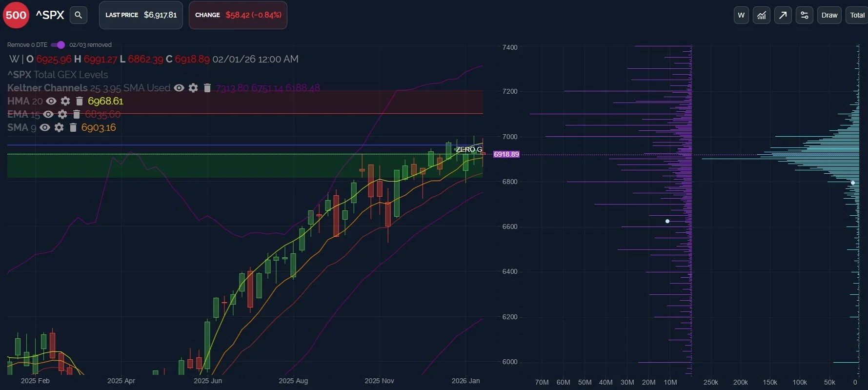 Looking at the total picture currently, we’re left with a slight bias toward the negative as SPX shows negative net GEX and remains below the daily and weekly HMAs. GEX levels that may serve as near-term magnets include 6800 to the downside and 7000 to the upside, which may become relevant if SPX can recapture 6950 again.