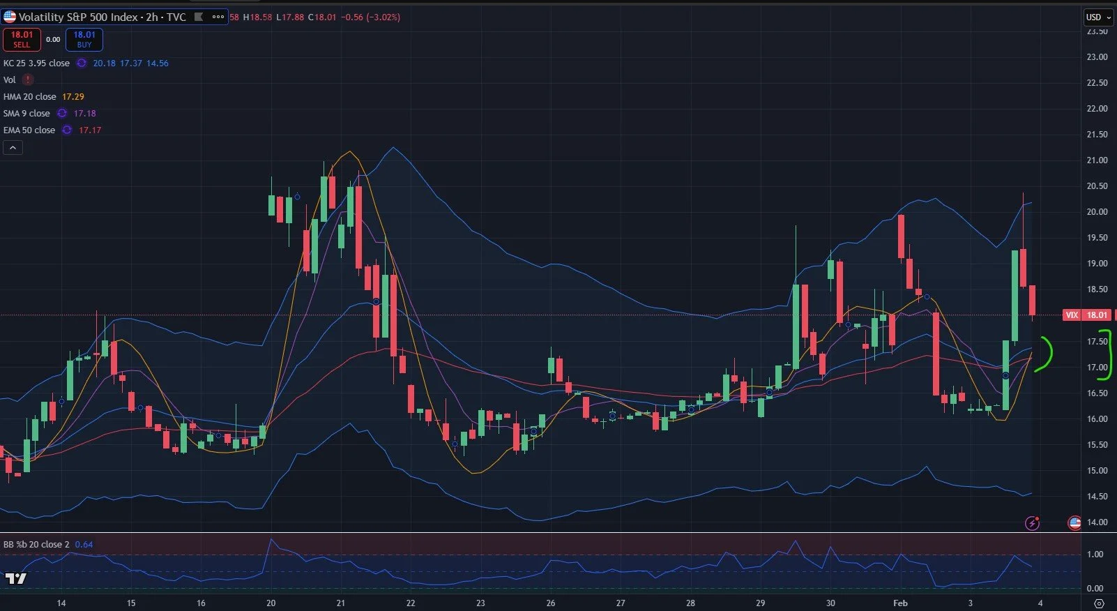 Zooming in, we see the 2-hour chart reflecting multiple indicators clustered around the 17.20-17.30 area, which is a first stop to the downside that I’ll be watching for potential reversal back up for the VIX.