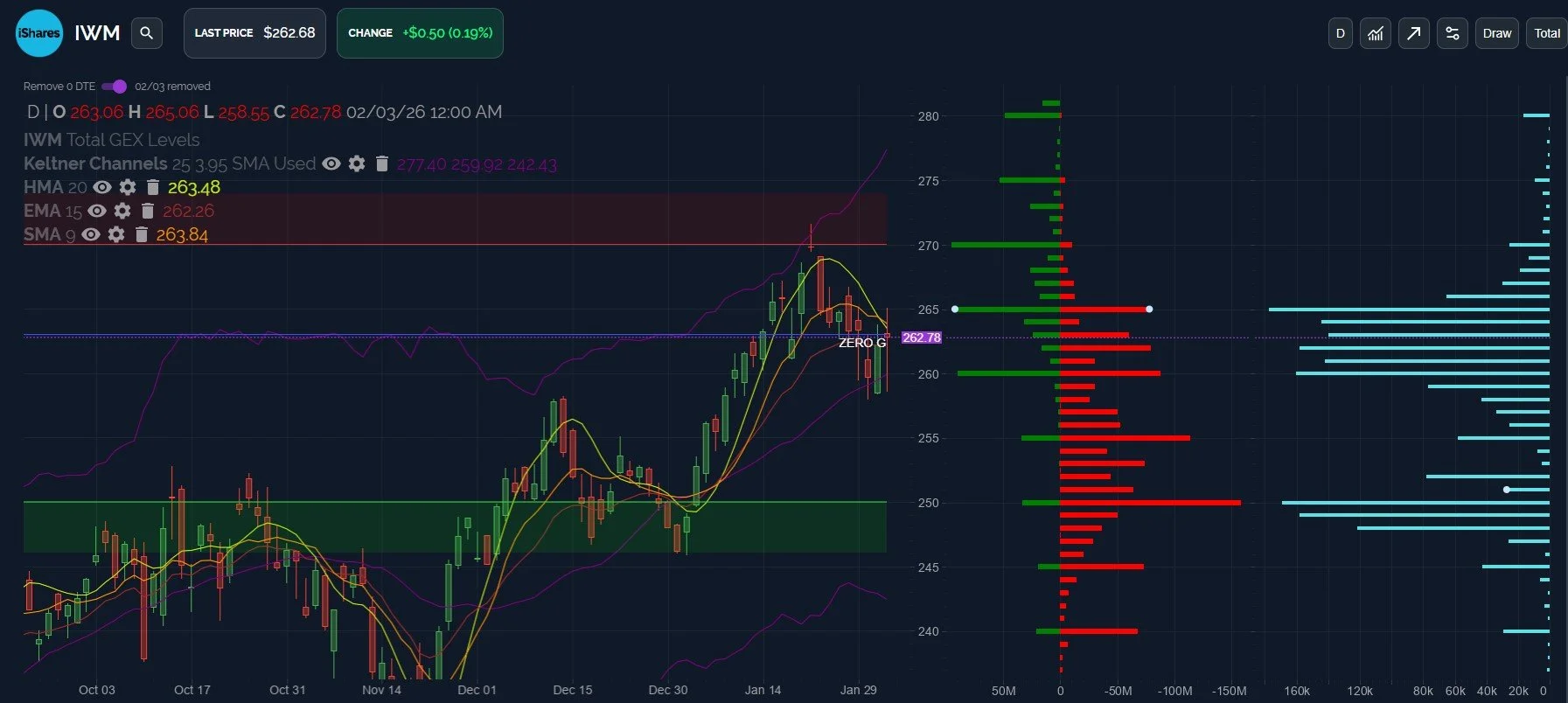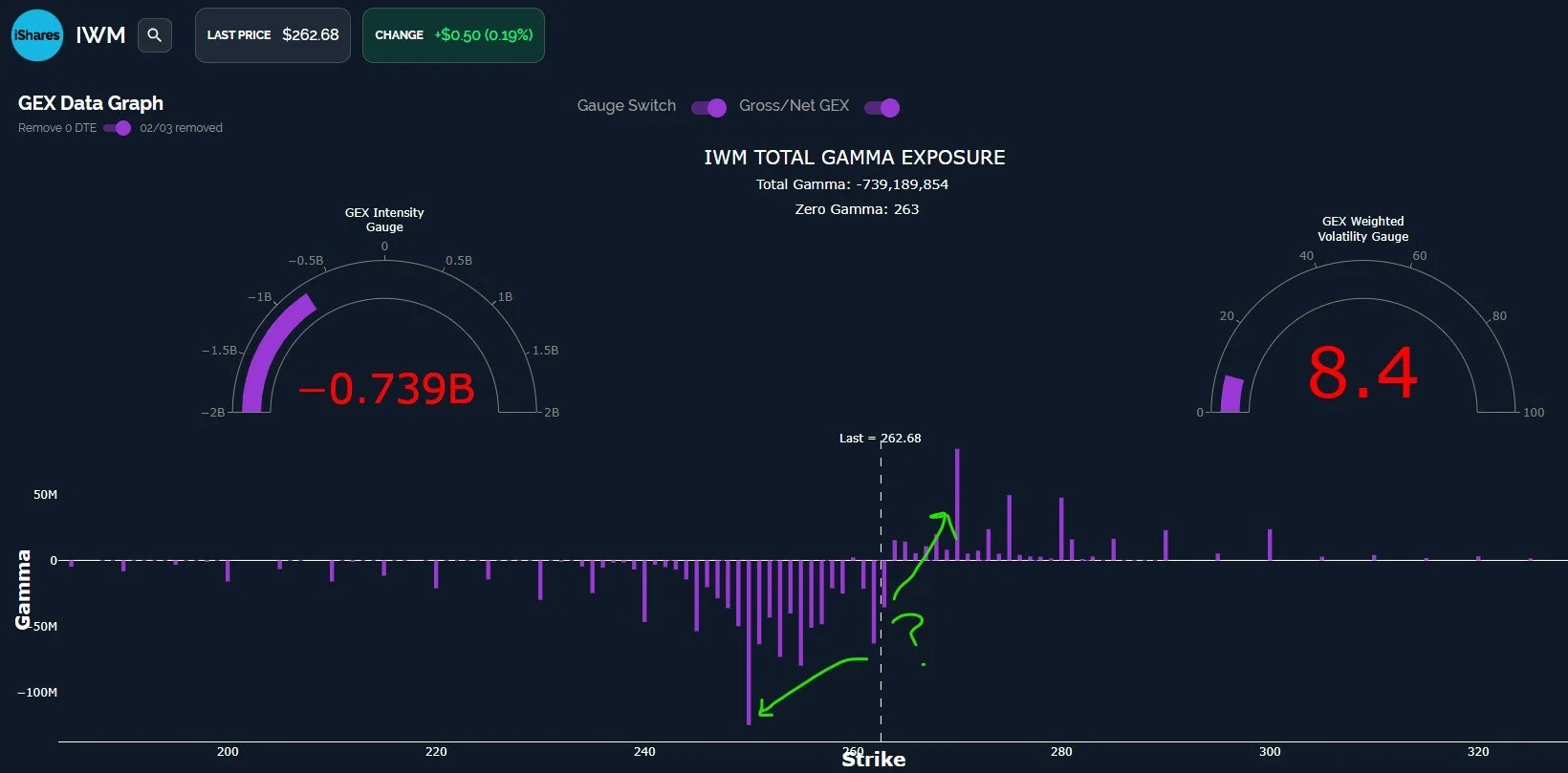 The net GEX picture shown indicates 270 as the most likely upside target, but we don’t see much beyond that in terms of meaningful GEX.