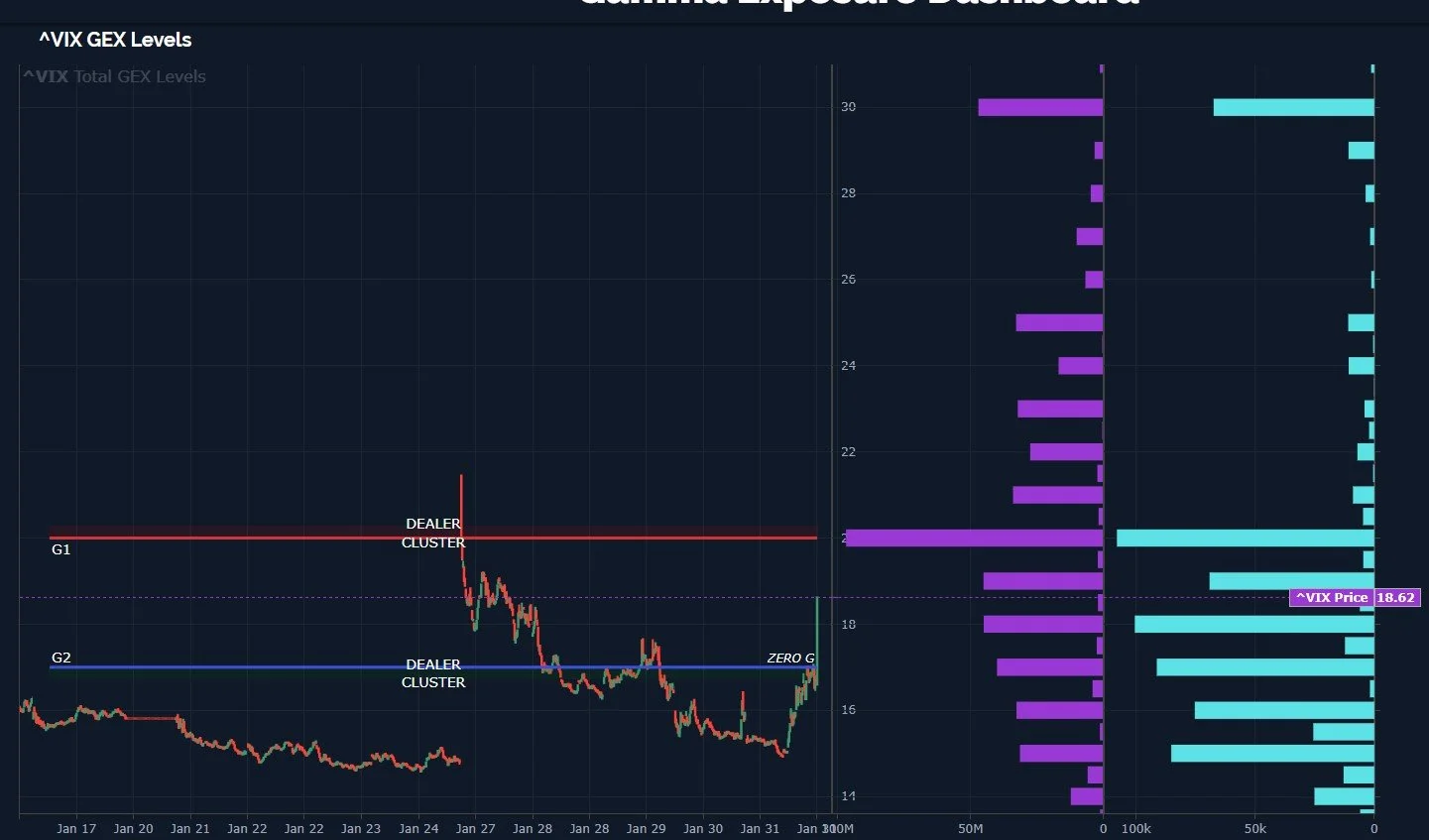 Very little volume at higher strikes on the VIX today, except for the 30 strike, which has been growing for some time. The GEX at 30 is concentrated almost evenly on February 19 and March 18, with a slightly higher amount of GEX on March 18 (shown on our 3D graph, not shared here today). I don’t see any reason to expect VIX 30 tomorrow, in other words, but anything can happen.