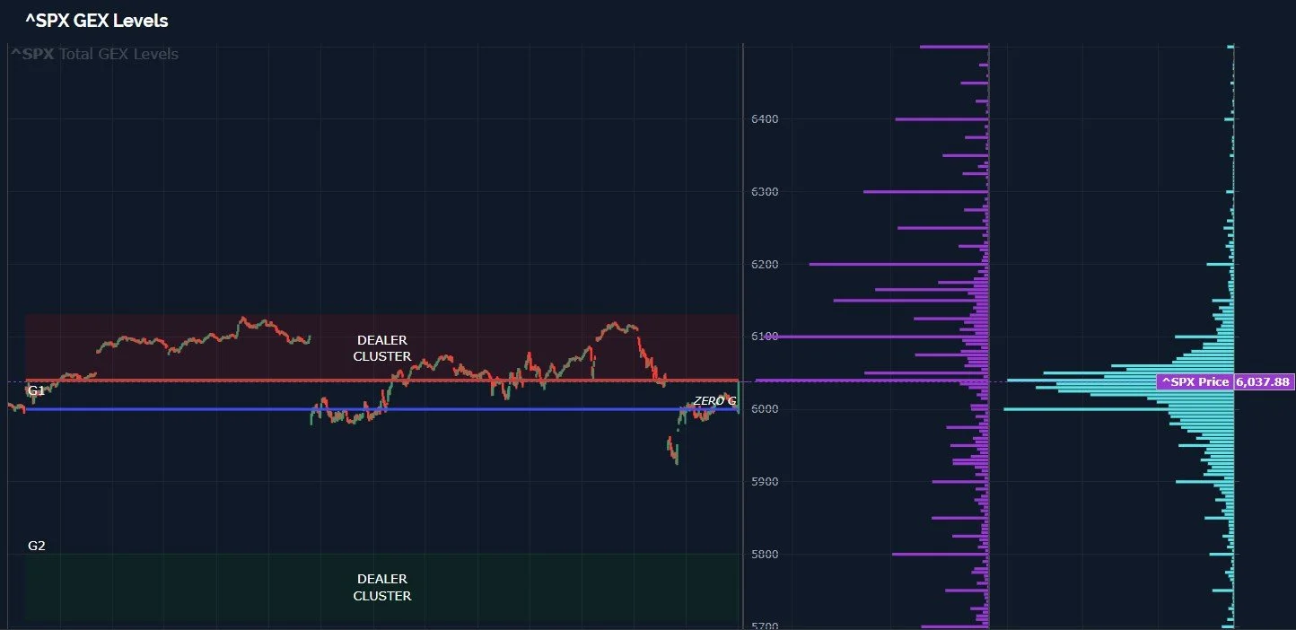 The GEX Levels chart shows this best. You can see 6100, 6200, and even 6300 are contenders for potential targets down the road. As mentioned in the YouTube video, this may not happen immediately, and I’ll get into a few reasons why. First of all, you can see that we’re at the doorstep of the upper Dealer Cluster zone, a place where dealers may increase selling pressure. Sometimes we overshoot to the upside temporarily, or GEX can shift higher, but for now, 6100 looks like a solid possibility as we enter the box. It’s noteworthy that the lower Dealer Cluster zone is lower than it has been in recent weeks, showing 5700-5800 on the downside, but we need to discuss timing surrounding when/if we might reach that zone.