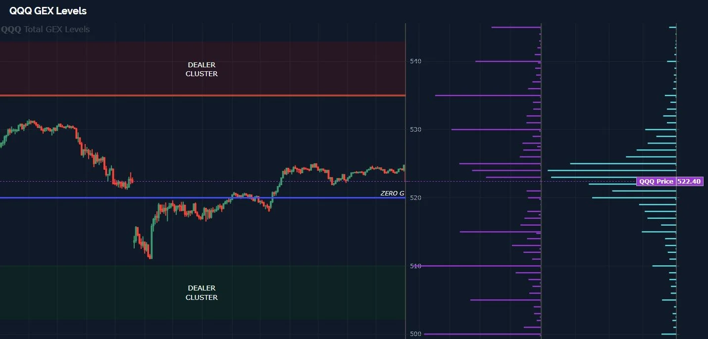 We mentioned QQQ met important resistance, seemingly a bit earlier than SPX, and of course QQQ will feel the brunt of any potential selling tomorrow in GOOGL and AMD. We also see a slight skew toward the downside in terms of the purple GEX bars, with 500 and 510 really standing out. Otherwise, QQQ is sort of in the middle of the road, we see the upper G1 Dealer Cluster starting at 535 and the lower one at 510. Let’s look further for clues regarding which we may hit first.