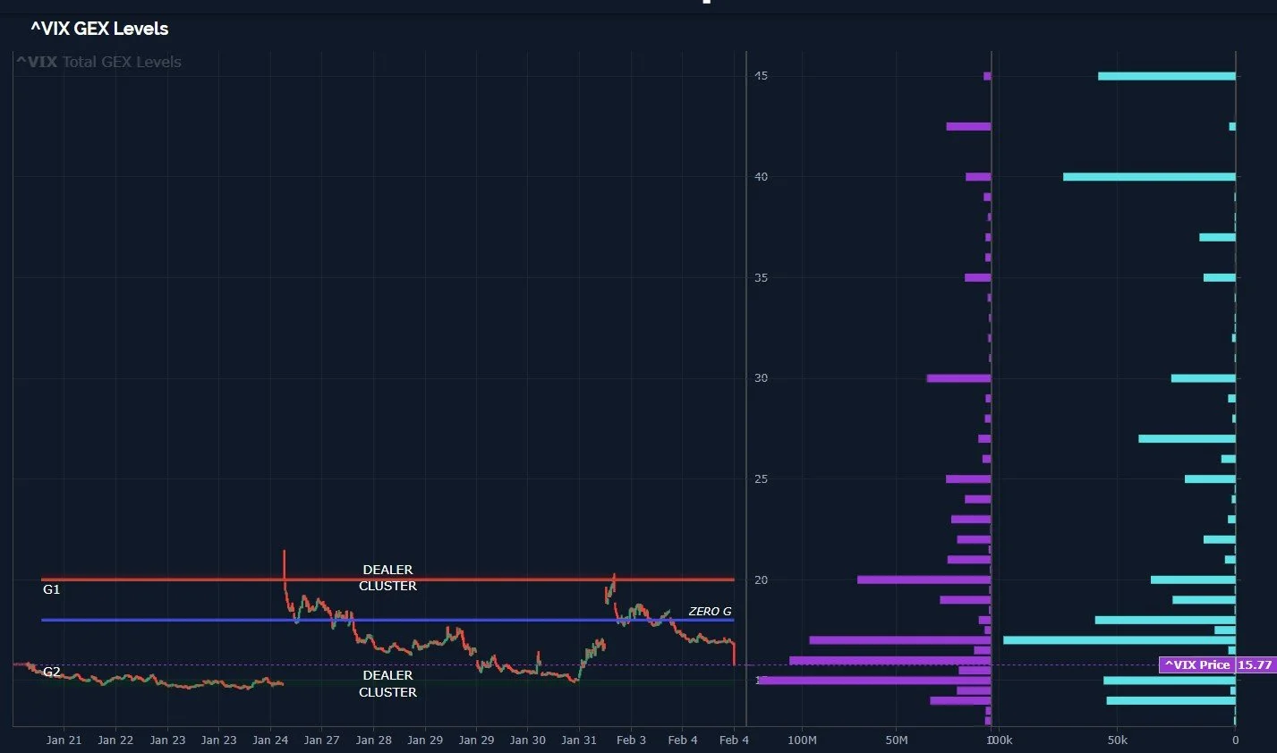 Lastly, the VIX lost the Hull on the 2-hour, 4-hour, and daily timeframes, something we noted this morning, quickly identifying 15 as a potential next target. GEX backs 15 as a possibility given that it’s the lower G2 Dealer Cluster, and 15 also represents the bottom of the 2-hour Keltner channel. We saw volume at 40 and 45 strikes worth noting today.