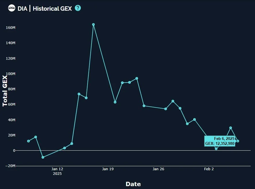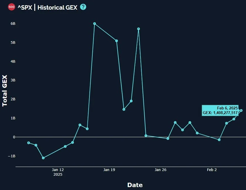 The historical GEX graph below shows GEX declining since the mid-January GEX high. I find it interesting that GEX topped out right before the last push higher in price, which lasted for about a week before consolidating sideways. During this entire time, GEX was decreasing, leading to today’s slightly positive reading near the zero line.