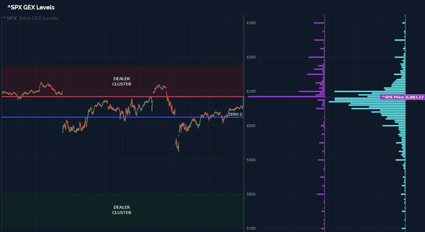 The timing of hitting anywhere close to 6200 remains unknown and uncertain, which is why we’ll continue incorporating other factors into our comprehensive analysis. The current G1 Dealer Cluster shows 6100 to be the beginning of the red upper Dealer Cluster, so a pullback could technically begin anytime once we’re near or within that box. We still see more GEX weighted toward higher strikes, including 6150 and 6200, even up to 6300, and overall we think the odds of reaching those targets by late March look fairly good.