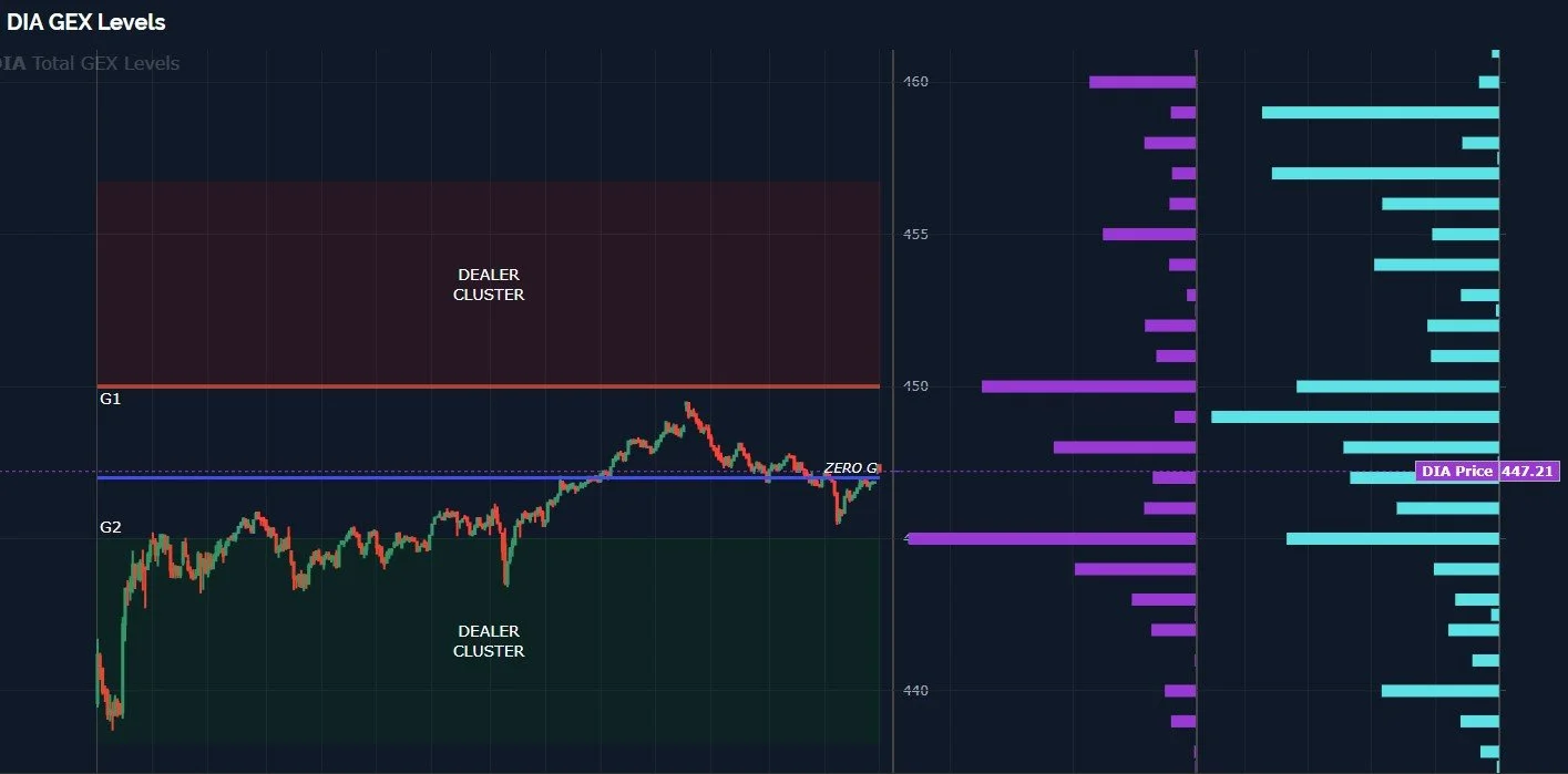 Today was the first day in a while where our Discord 0 DTE channel saw an accurate early preview of where gamma (GEX) was headed for SPX, but it took all day to get there. SPX got there though, reaching the advertised 6080 right before the close, closing at 6083.57. We’ll pick up where we left off in the newsletter, starting with DIA, and we cover a number of additional tickers including BTC, NVDA, IWM, and AMZN in today’s YouTube video, which you can check out by clicking here.