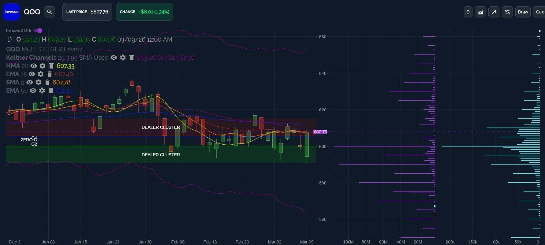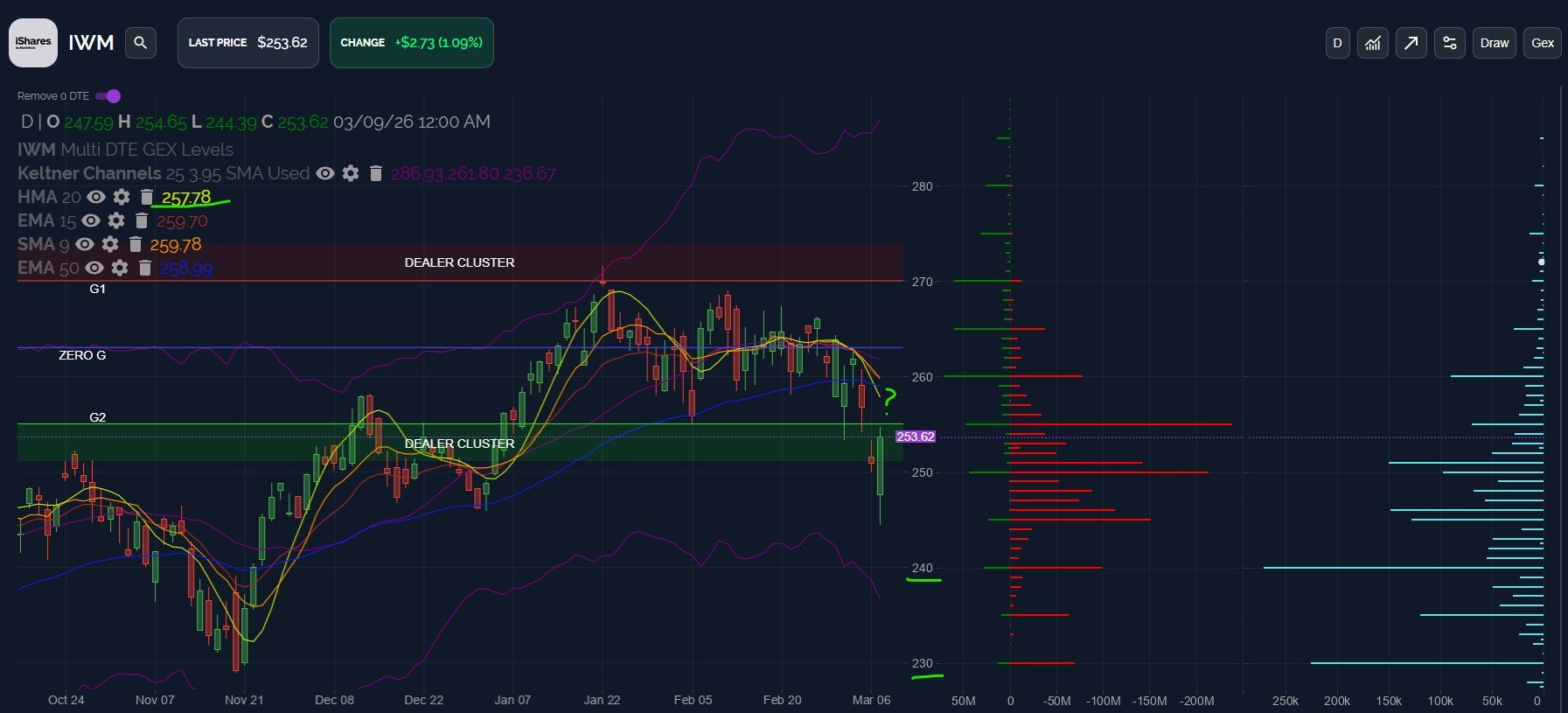 IWM displayed the earliest signs of a potential rebound today, based on the Keltners and GEX, and IWM may still hold potential to rally toward 257-258, with a test of those levels potentially revealing intentions toward either upside targets as high as 270 or lower targets (where most of the volume was concentrated) at 230 and 240.