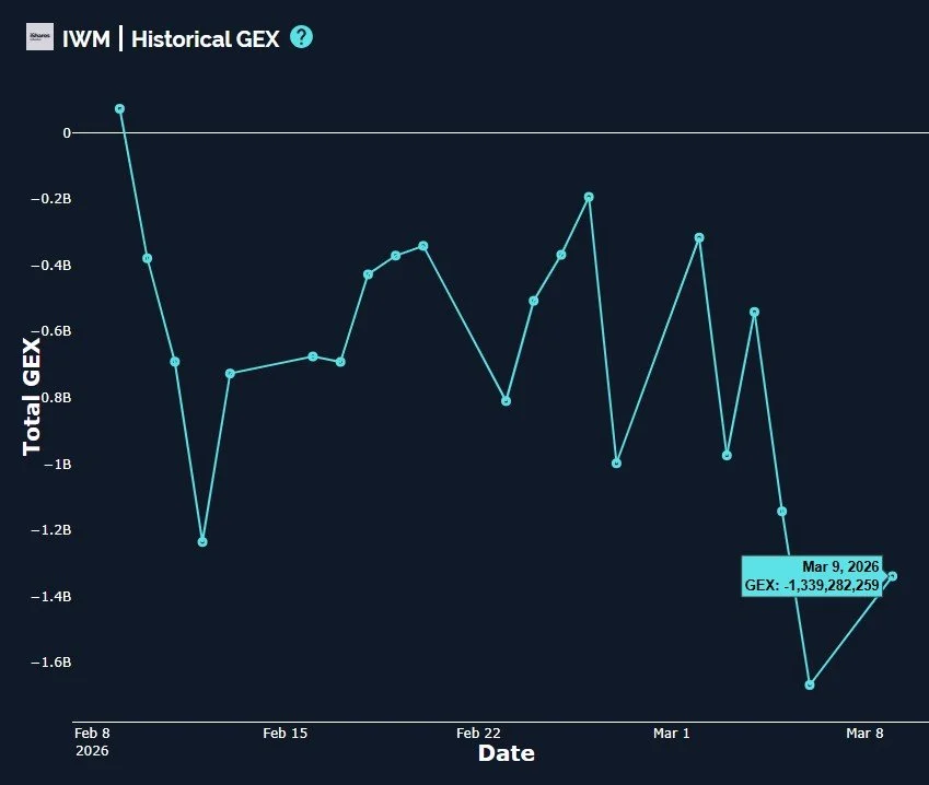 IWM saw a net GEX rebound today, though weak, remaining in negative territory. A more bullish rebound in GEX would be nice to see with price rebounding strongly, so we’ll continue watching in the face of uncertainty.
