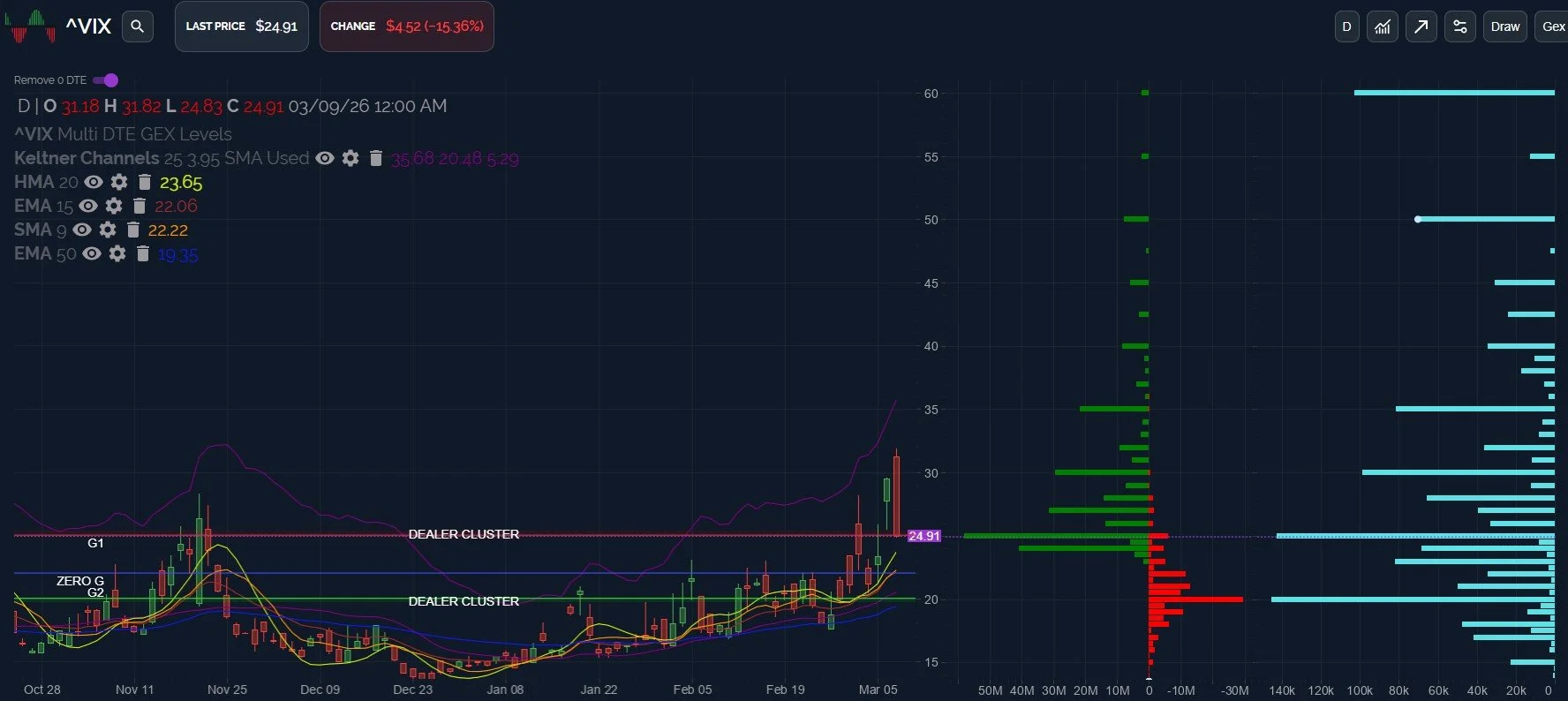 Market bulls may want to see the rising HMA support at 23.65 broken to the downside for a daily close, while volatility bulls may look for the opposite, with the momentum of the current trend and volume at higher strikes up to 60 being marks in their favor.