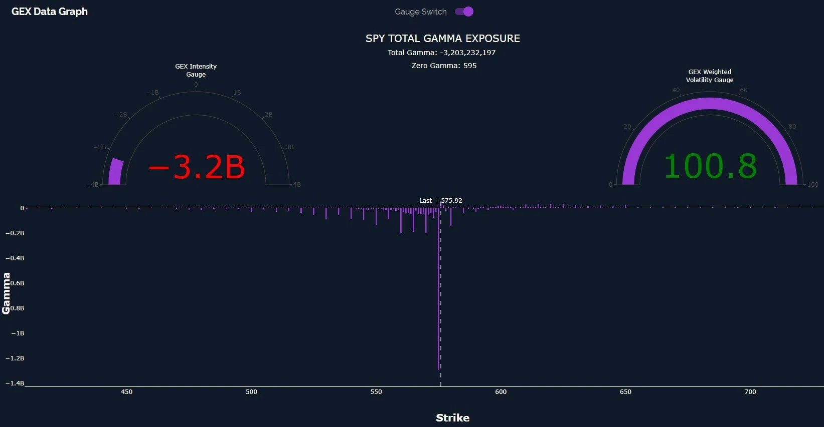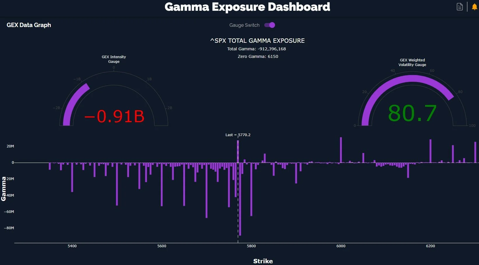 Looking at the gamma exposure (GEX) Graph above, we see SPX maintaining negative GEX that is close to what we would consider strongly negative at close to -1B. 5750 and 5700 are the next big spots to watch if additional attempts are made to push lower again, and the upside picture is fairly open until 6000 at this moment, at least once 5800 is conquered. It’s likely that GEX will shift once we breach 5800, but for now, 6000 as an upside target appears realistic.
