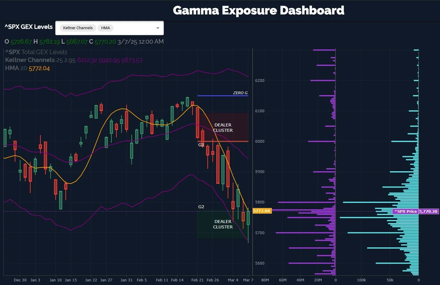 SPX once again touched the lower Keltner channel Friday, but impressively, bulls were able to turn the tables, rallying right into the declining Hull moving average. Closing right at 5770 puts SPX essentially at the line, a place we’ve visited every one of the last 7 trading sessions, closing at the line 3 of those sessions. Bulls might have rather seen price close decisively above that line, but it’s not surprising to see progress halt at that line, given the trend and given recent rejections. From a loosely defined maximum pain philosophy, I wouldn’t be surprised to see the next move be a gap above or below the line, otherwise it’s too easy for day traders to join in the party for the more complete move, right? I recall recent major bottoms involving a few gaps off of the lows. We definitely need to see SPX holding above the yellow line to grow some conviction that the rally has legs, and that the large GEX at 5800 can be overcome.