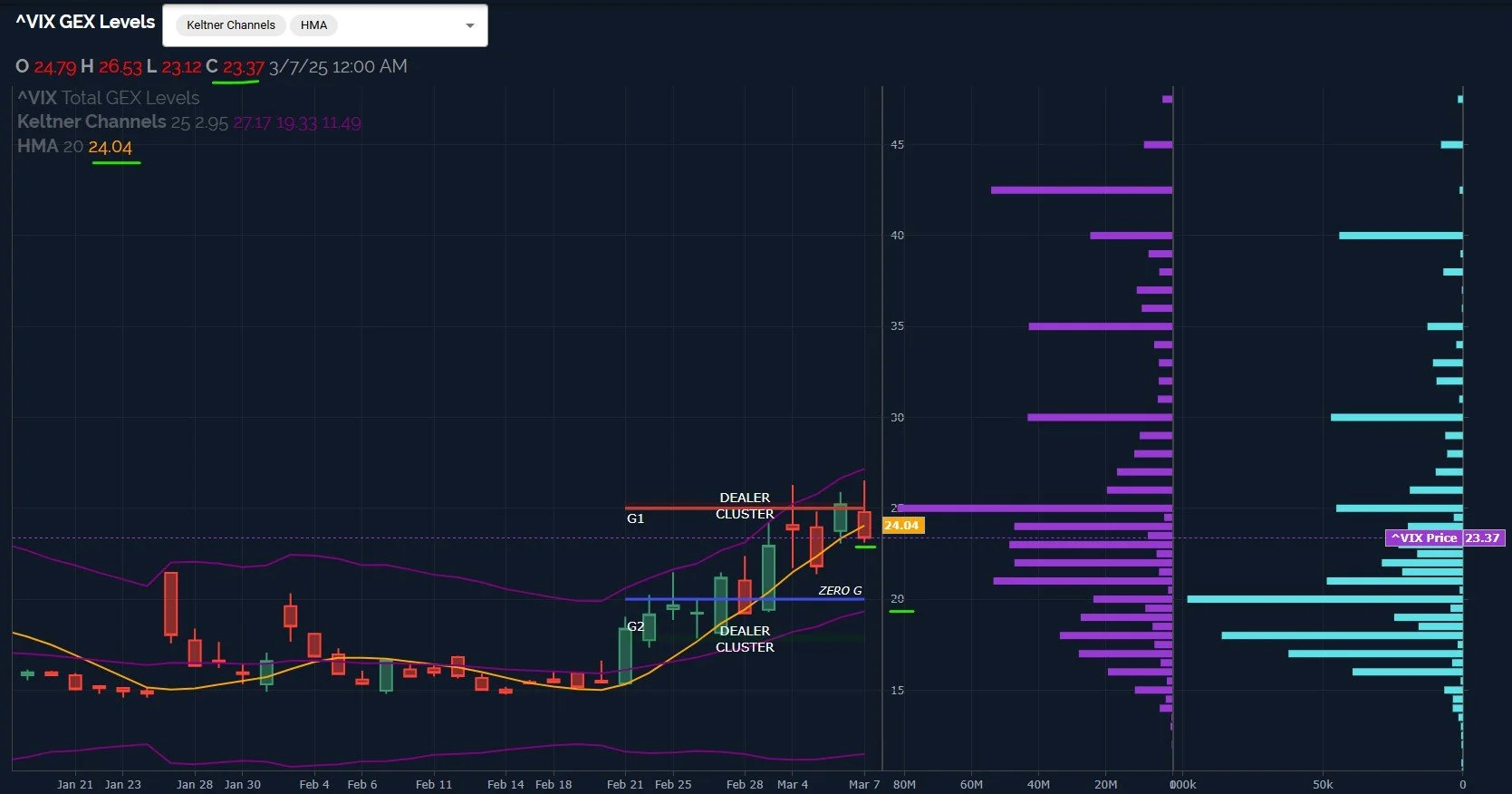 The VIX also gives bulls hope for the 2nd time in 3 days, closing below the Hull by roughly 2.5%, a solid close beneath the line. Keep in mind Wednesday we also saw a close below the line, but then we saw the VIX gap back above the line Thursday, so we aren’t out of the woods yet until we see continuation. It’s encouraging that the highest volume was at the 20 strike, followed by t he 18 strike. We still see volume and GEX at 30, 35, and 42.5, so we can’t ignore eventual expansion for the VIX to higher strikes.