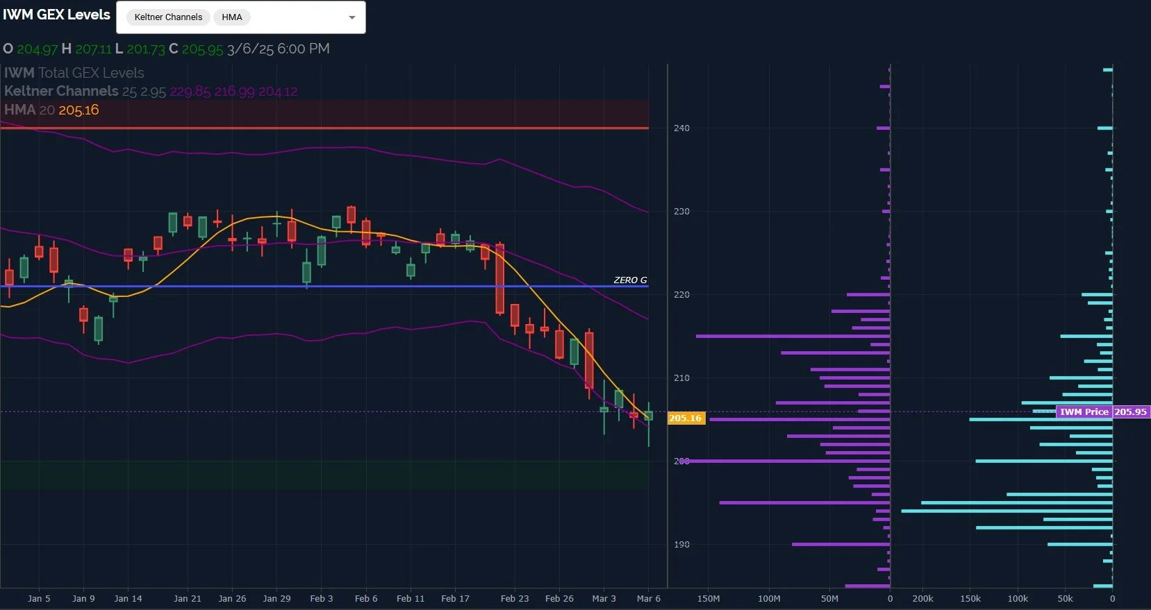 Here’s what I find most encouraging, other than the fact that DIA was positive from Tuesday through Friday: IWM closed above the daily Hull for the first time since February 18, and as regular readers are aware, I consider the Hull to be an important line-in-the-sand for a directional bias. Above the line usually means longs get paid, though we are admittedly very close to the line, conveying higher odds but not necessarily a guarantee (nothing is ever a guarantee anyway). IWM is very one-sided with negative GEX at the moment, and fairly close to a negative GEX extreme, conditions that support the idea of a quick move higher to lead the way for other indices. With big negative GEX at 215, we will watch what happens in that area to try and assess the likelihood for continuation above that line (also close to the middle Keltner channel) or failure again, which would be convincing of the potential staying power of this downward slide.