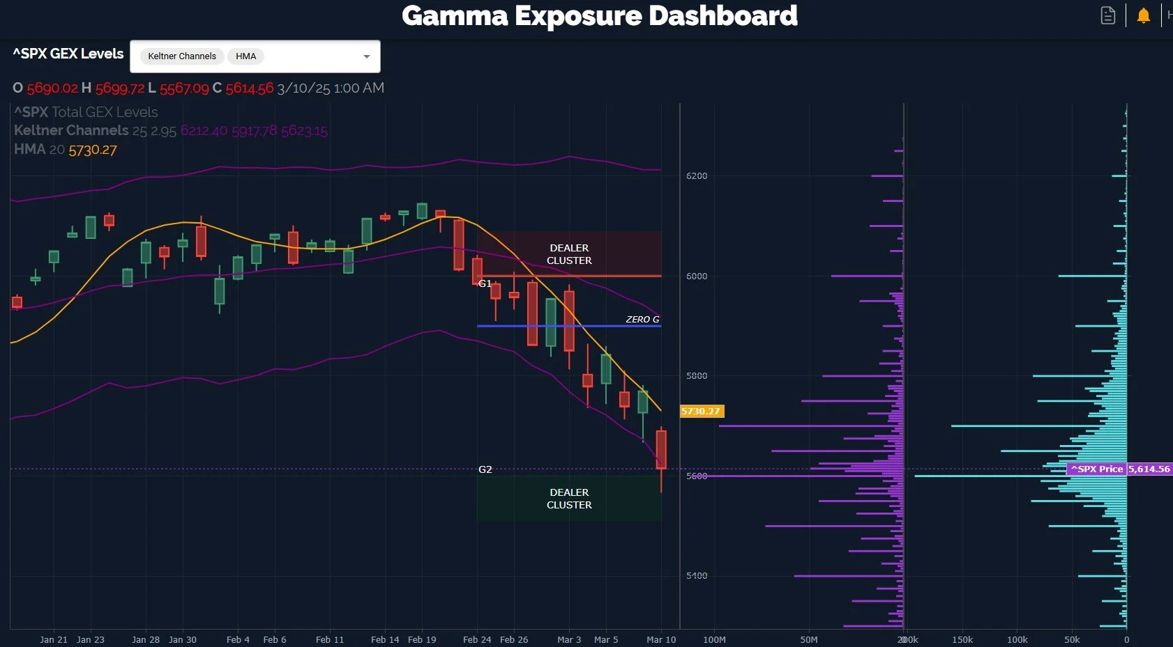 Our morning update in our Discord Gamma Exposure Updates channel noted “The current picture points to the possibility of 5600, with 5500 as a bit ‘scarier’ destination.” Little did we realize we would reach the middle of that range before the day was over. The negativity today left SPY with a deeply negative total GEX picture, not far from a -4B extreme reading. With GEX remaining negative going on 3 weeks, we don’t yet see the flip to positive GEX we’d like to see, but we are also keenly watching the risk/reward of a possibly dramatic extreme negative GEX bounce to the upside. The larger view picture remains uncertain with the current decline fitting typical correction standards.