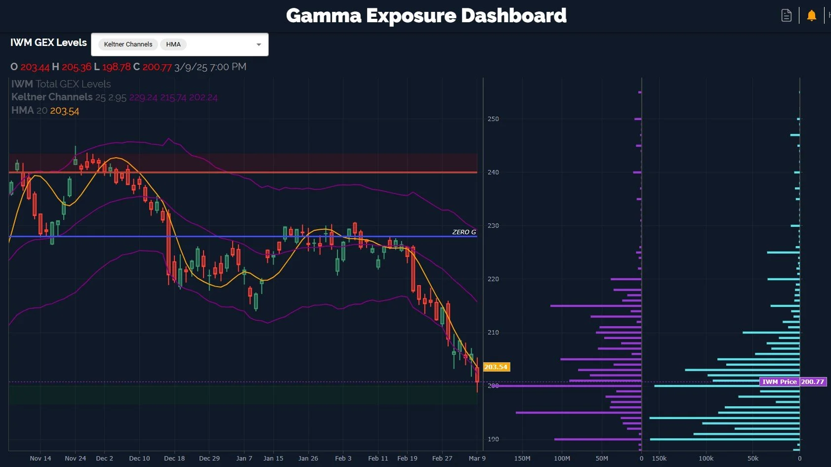 Looking at IWM’s daily chart, we are in the lower Dealer Cluster zone, though volume remains high at 190, 195, and of course at 200 where we closed. I still like IWM as a possible early rebound vehicle given the well-advanced decline in the Hull, not far from IWM’s current price. 215 is not just the middle Keltner and the Hull moving average (on the weekly chart) but it’s also a sizable GEX cluster, so we have a confluence of different timeframes showing 215 to be important. I see this area as an important resistance zone based on the current picture.