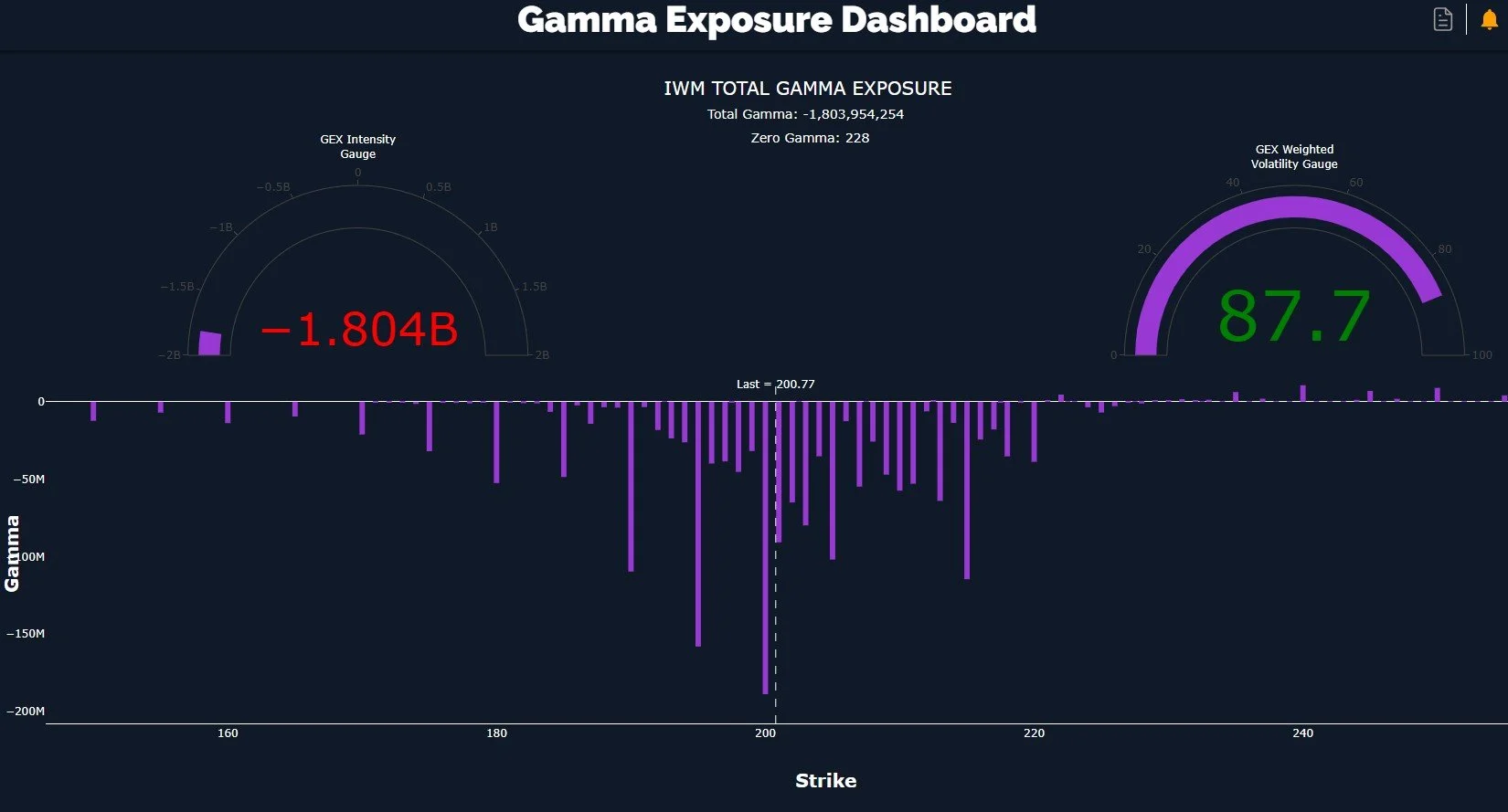 IWM is also extremely one-sided with a focus on the negative GEX side of the aisle, and near an extreme reading, currently at -1.8B. If we zoom out to the weekly, which we cover in YouTube tonight, we see 190 as a possible downside target if we continue lower. The lower Keltner is currently at 192 on the weekly.