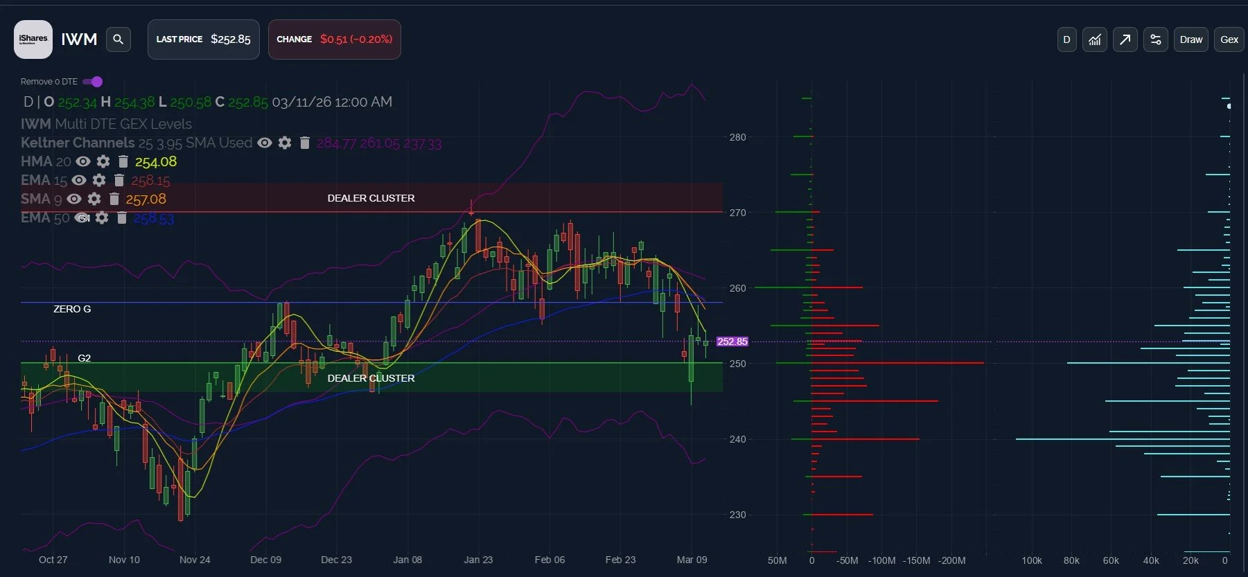 IWM’s lower Keltner channel is within 3 points of 240, which I view as a potential downside target.I’m also watching the GEX Intensity gauges for all indices in hopes of seeing a contrarian extreme negative reading, though that’s not a primary factor in my own analysis.