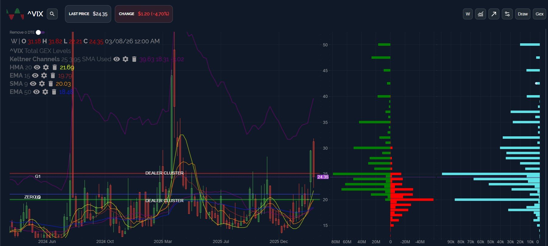 The upper Keltner channel is pointing sharply higher at 40, though 35 represents the largest GEX cluster beyond 30.