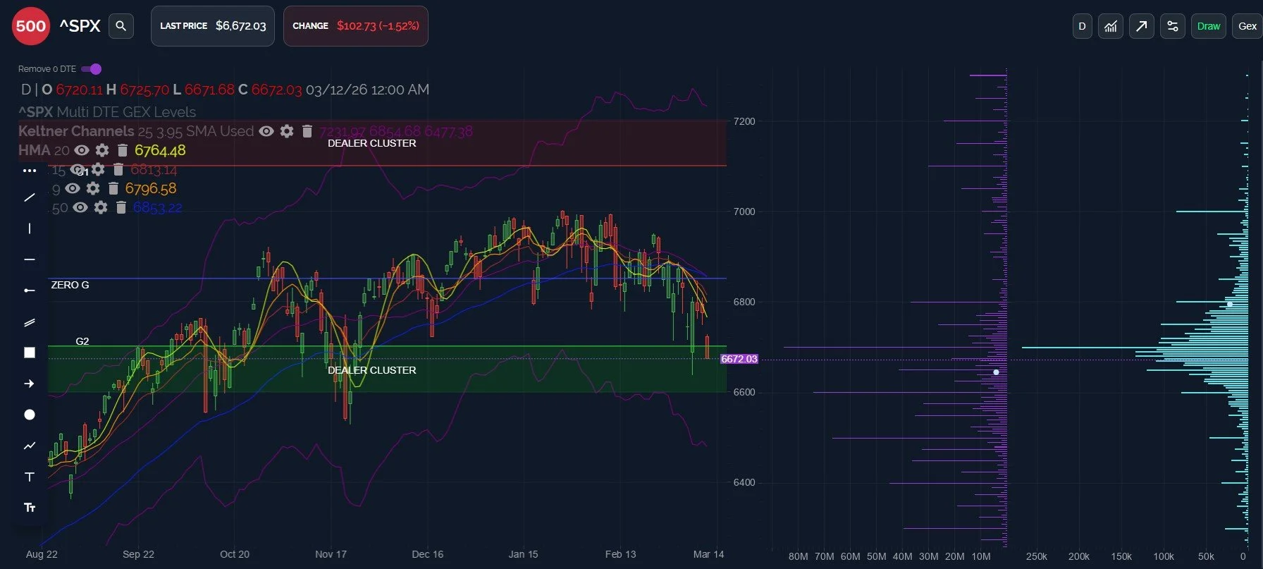 The largest net GEX clusters on either the positive or negative side range from 6400-6600, and the lower Keltner channel is still near the 6500 mark.