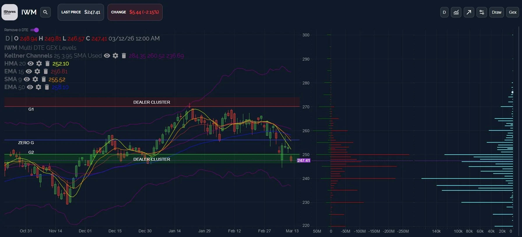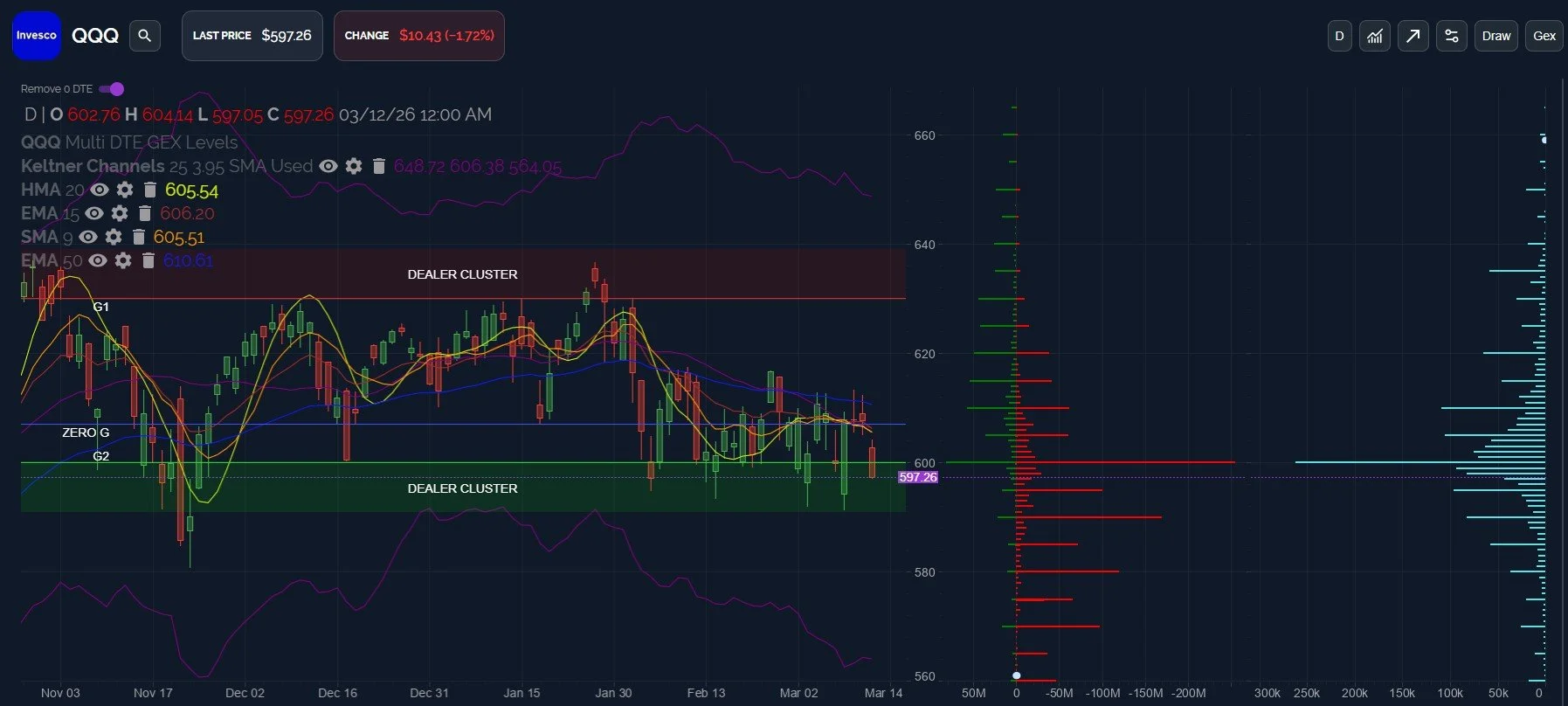 The lower Keltner channel near 565 doesn’t yet match with meaningful negative GEX relative to other negative GEX strikes, but the positive GEX clusters above 600 certainly show little interest.